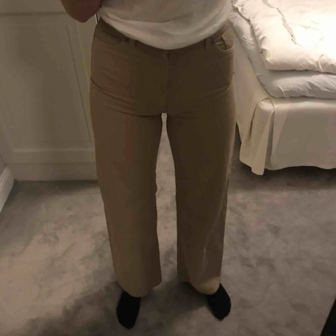 Snygga beiga vida byxor från Monki. Obs! Några få små rosa fläckar på baksida lår, se bild 3. Använda 3 gånger. Fraktar eller möts upp i Stockholm