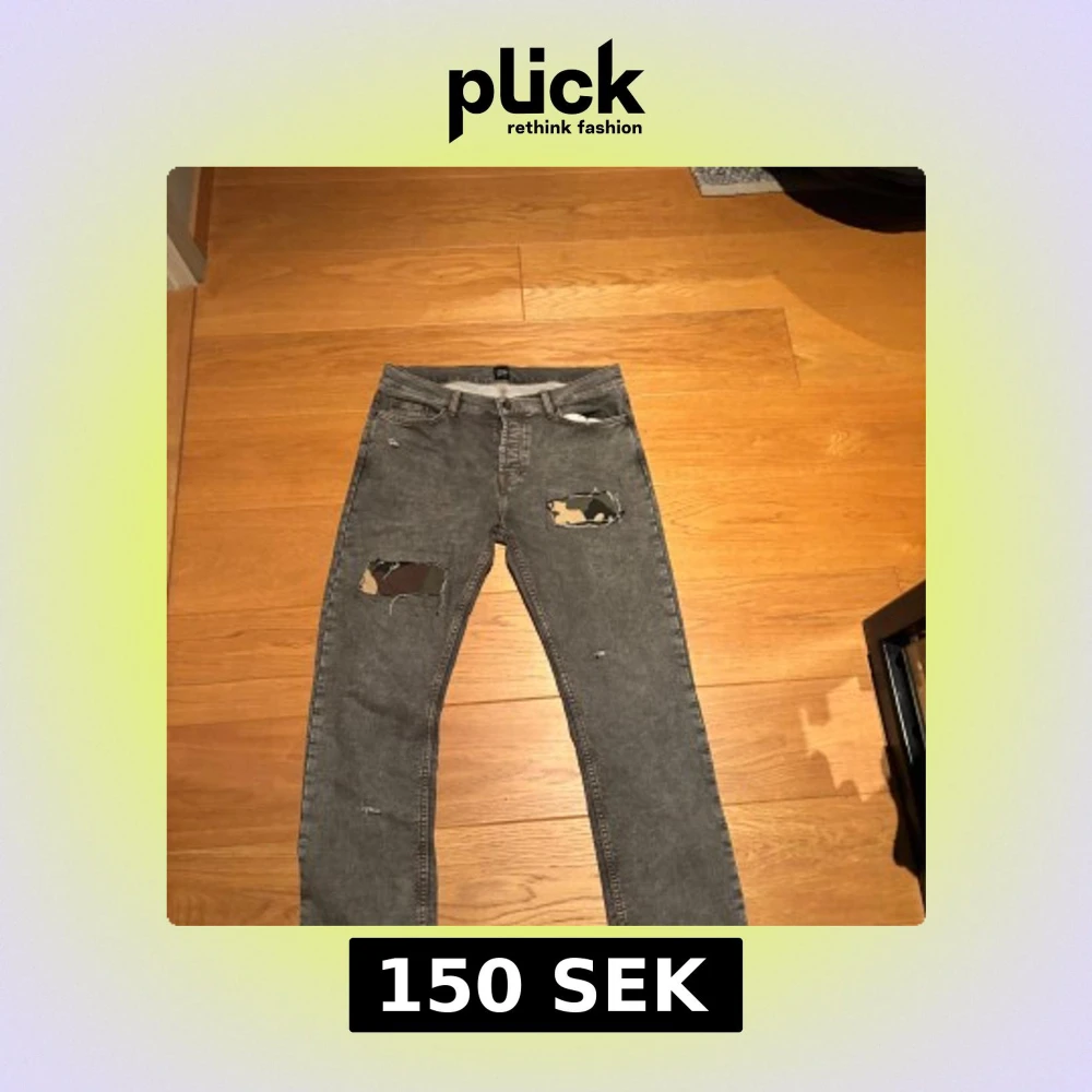 Säljer ett par grå jeans med slitna hål på låren där camouflage-tyg syns under. Modellen har klassisk femficksdesign och raka ben. Jeansen har en cool streetstil och passar dig som gillar edgy detaljer.