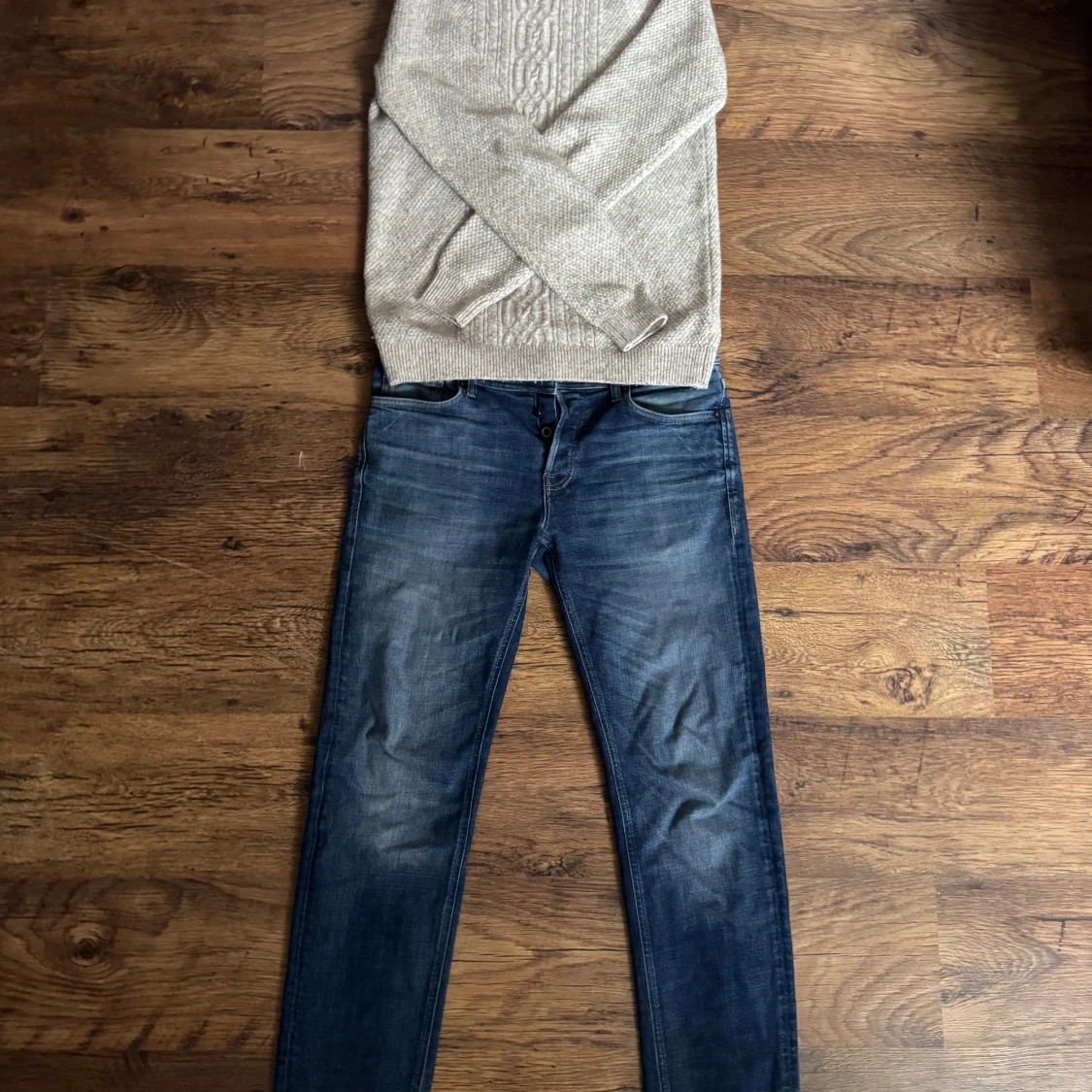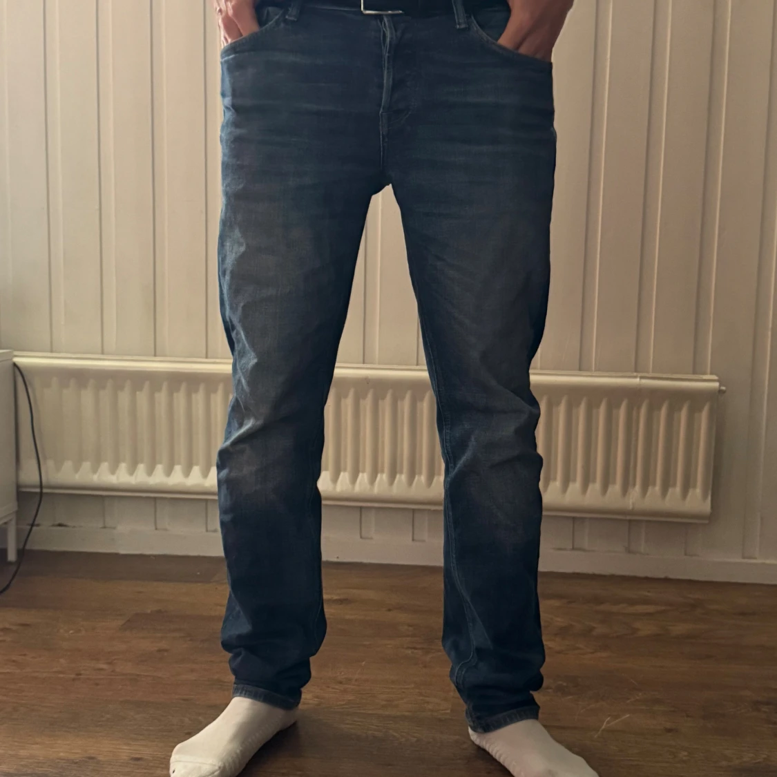 Säljer ett par klassiska blå jeans från Jack & Jones Med modellen: Tapered/Mike, med snygg tvätt och diskreta slitningar. Jeansen har normal passform, fem fickor och är tillverkade i bomull. Perfekta för dig som gillar en tidlös och avslappnad stil.