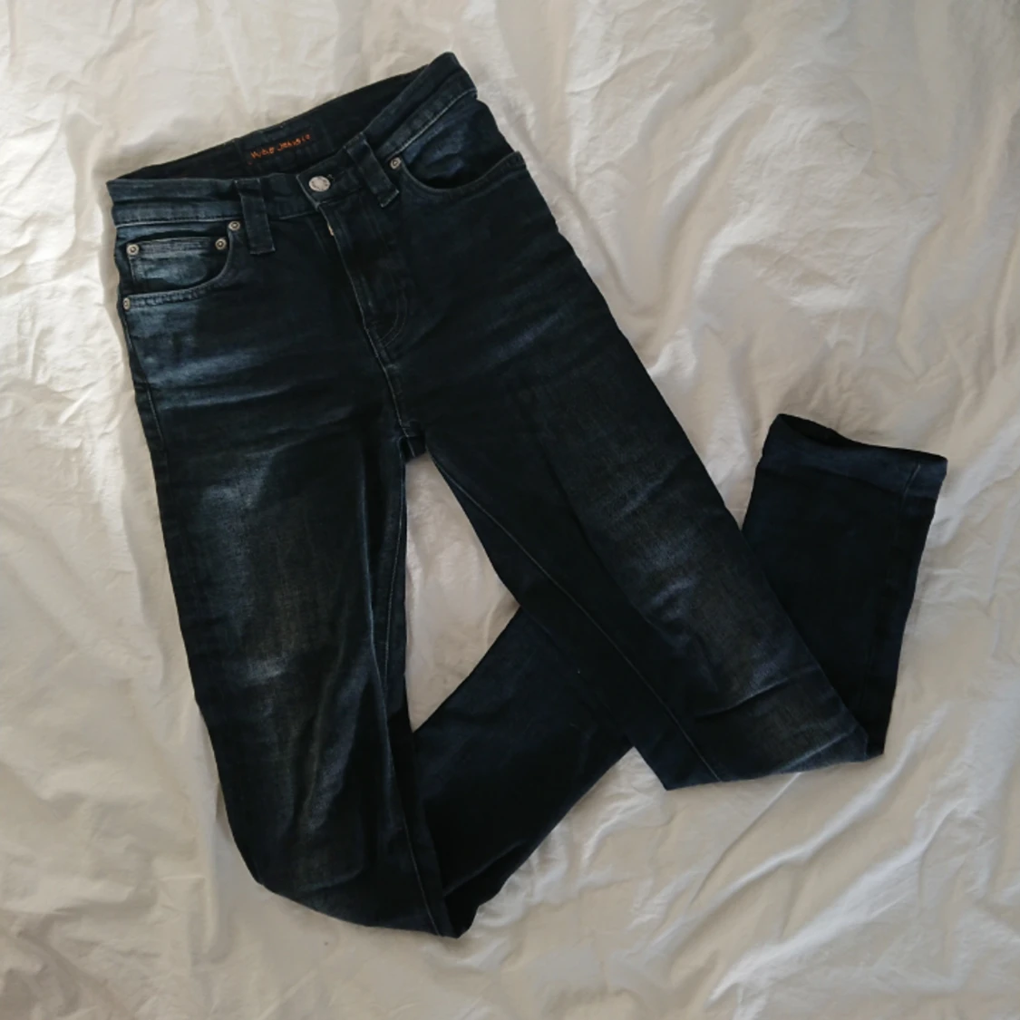 Ett par fållade nudie jeans i tight passform. Väldigt bra material, knappt använda! Skulle kunna vara vanliga jeans för korta personer (som mig) eller typ vid vaderna om man är längre. Längd 86cm (62cm från innerlår) Midja 62cm Höft ca 76cm Mötas i centrala Stockholm OK Frakt (extra fraktkostnad) OK