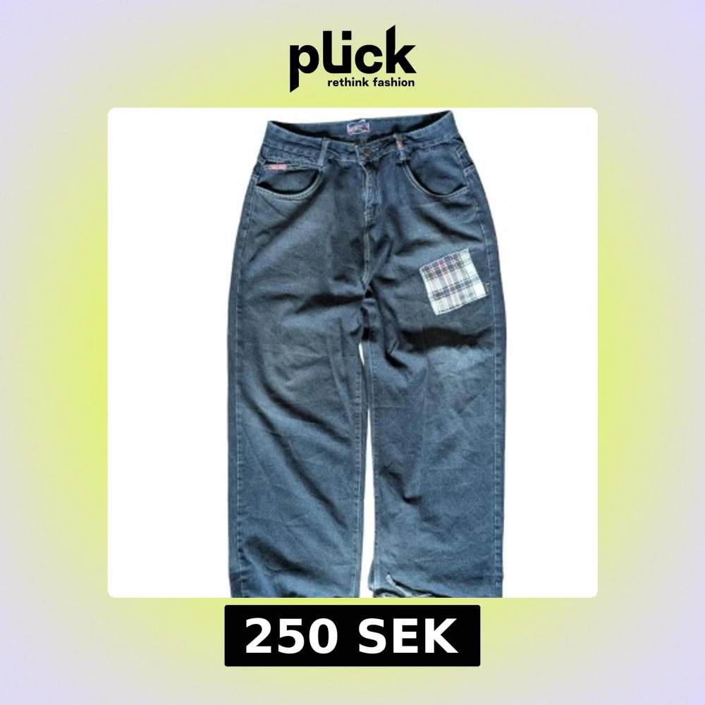 (F4k3) Jnco-jeans med lappar på höger bakficka och framtill. Storlek: XL Skick: Överlag i mycket bra skick men har rejält med "heelbite" (slitning vid hälen). Det bidrar dock till estetiken. Notera: Materialet är väldigt mjukt och bekvämt, men förvänta dig inte denim av hög kvalitet.