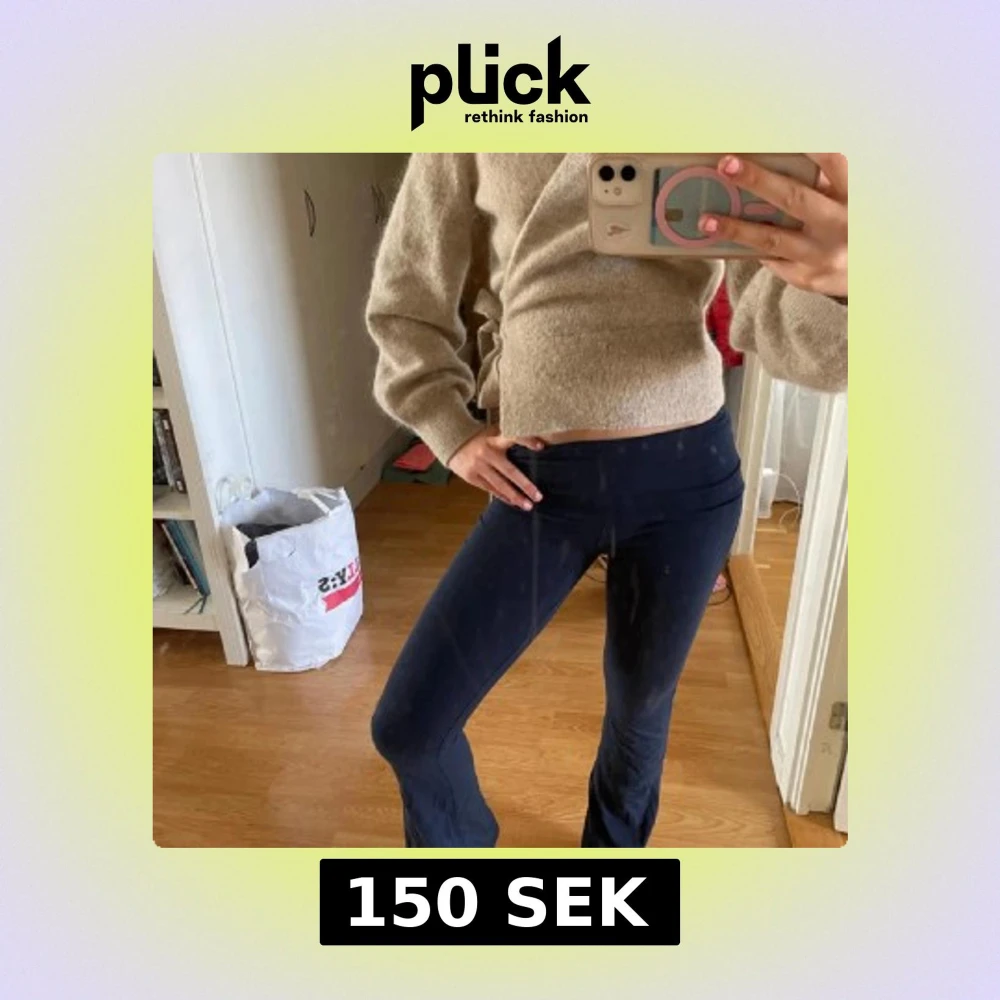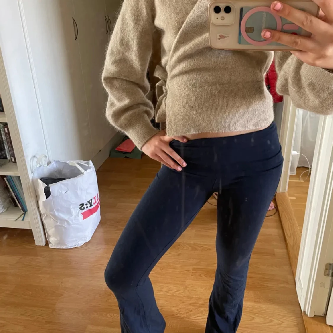 Säljer ett par mörkblå bootcut byxor med hög midja. Byxorna har en tight passform upptill och släpper ut vid benen för en snygg siluett. Perfekta för dig som gillar en stilren och trendig look.