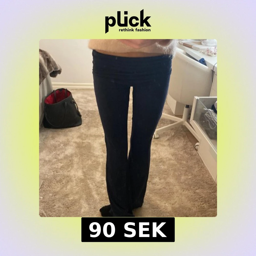 Säljer ett par mörkblå yougapants med bootcut och låg midja. De har en tight passform upptill och släpper ut vid benen för en snygg siluett. Perfekta för dig som gillar en stilren och trendig look. Materialet känns mjukt och stretchigt.