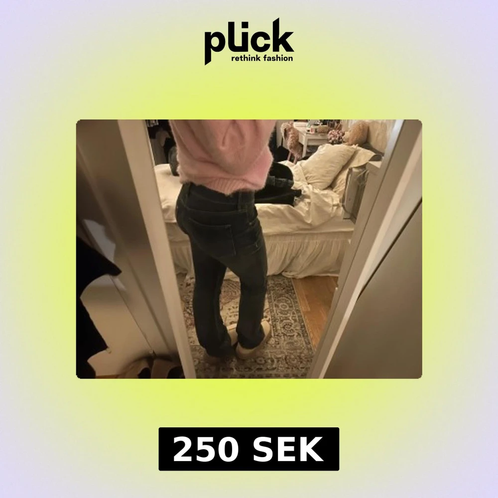 Säljer ett par mörkblå jeans med bootcut-modell och klassisk femficksdesign. Jeansen har normal passform och är tillverkade i ett mjukt denimtyg som sitter snyggt över höften och låret. Perfekta till sneakers eller boots.