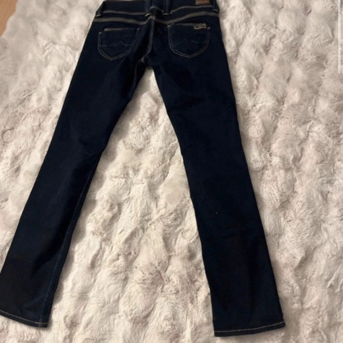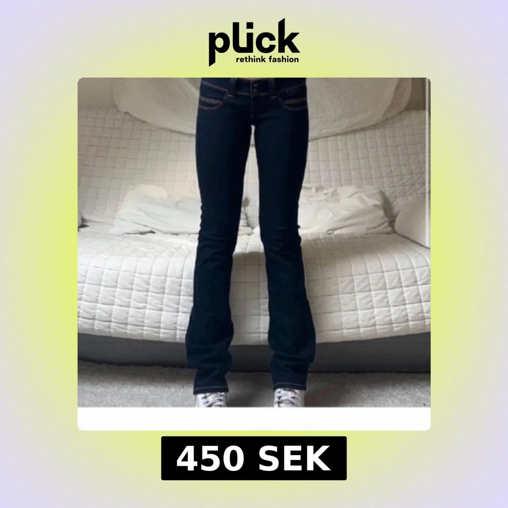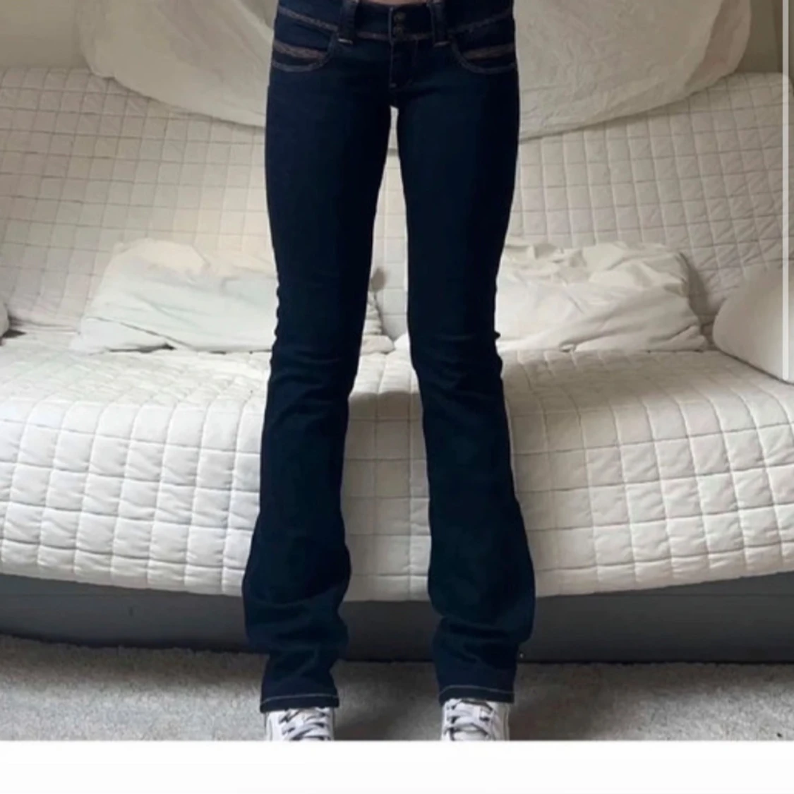 Snygga mörkblå bootcut jeans med låg midja och klassisk femficksdesign. Perfekta för en avslappnad stil med en touch av retro. Passar bra med sneakers eller klackar för en mer dressad look. W31 L34. Dom är små i storleken och passar mig som är en 27-28