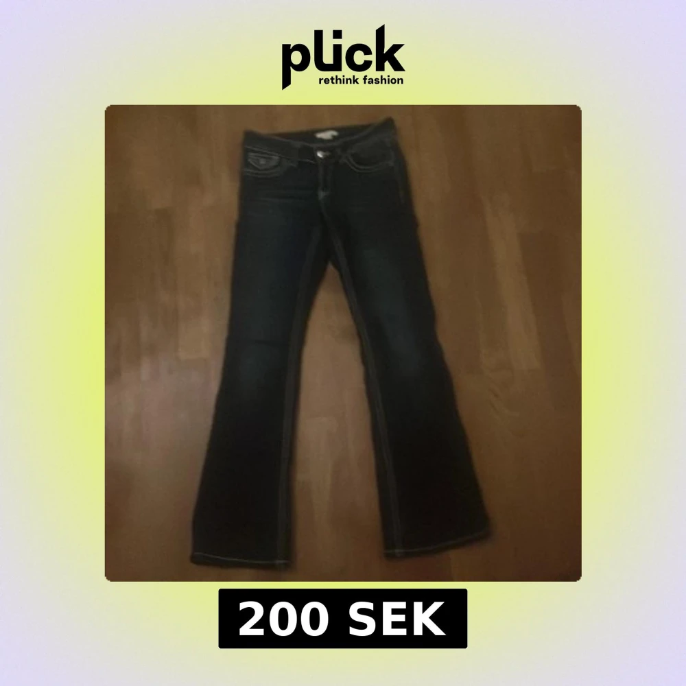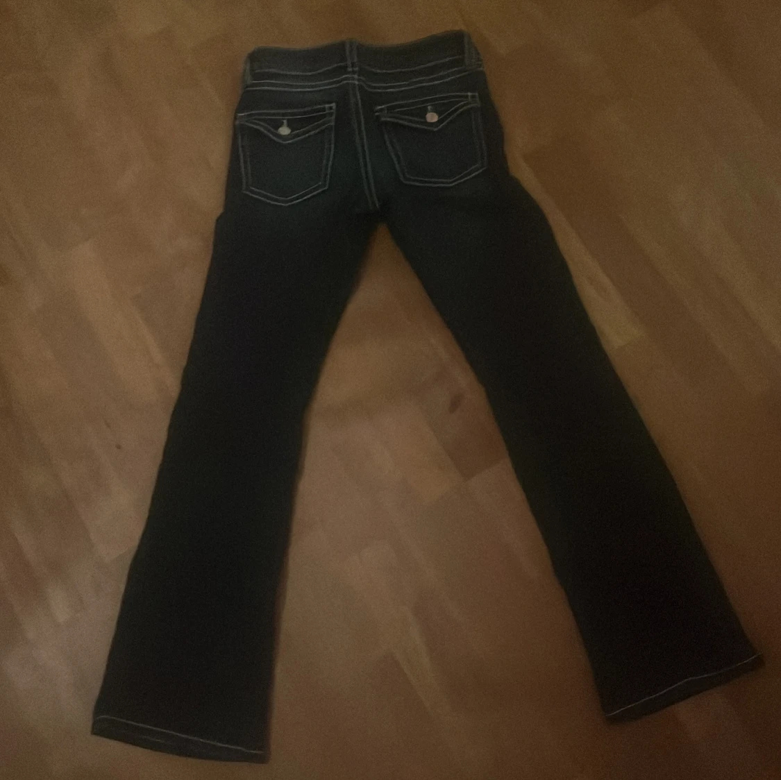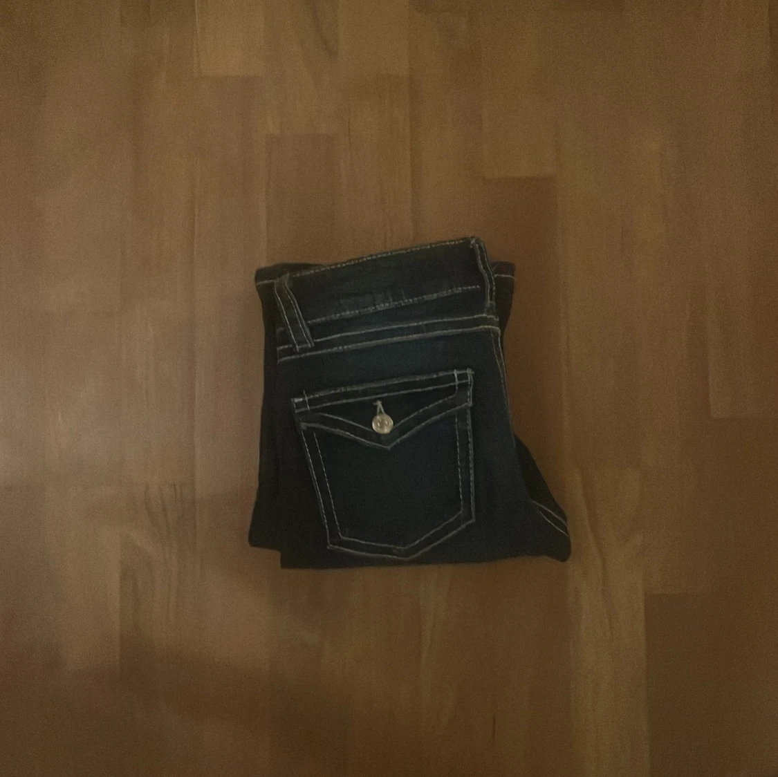 Snygga mörkblå bootcut jeans med klassisk femficksdesign och kontrastsömmar. Perfekta för en avslappnad stil. De har en knapp och dragkedja framtill.