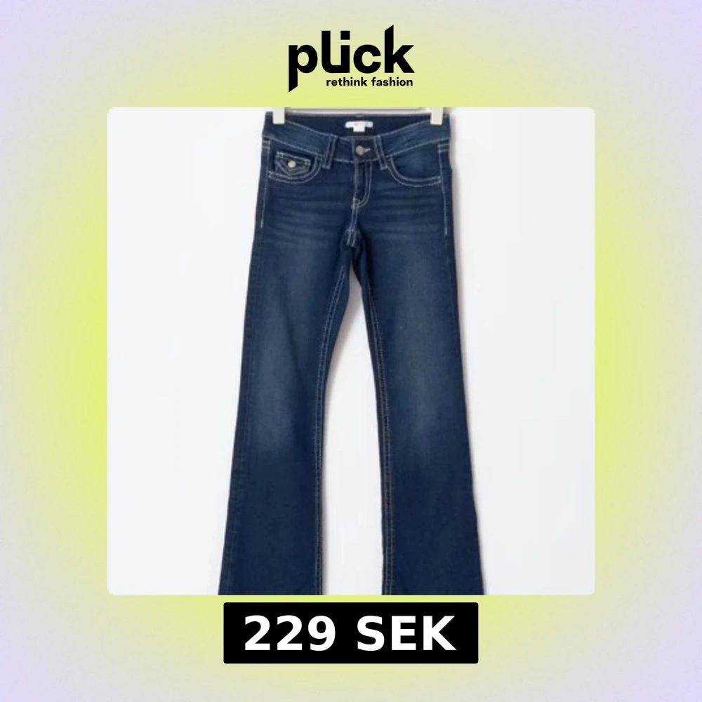 Snygga mörkblå bootcut jeans med kontrastsömmar. Men är lite nedtrampade. Du som köper står för frakten