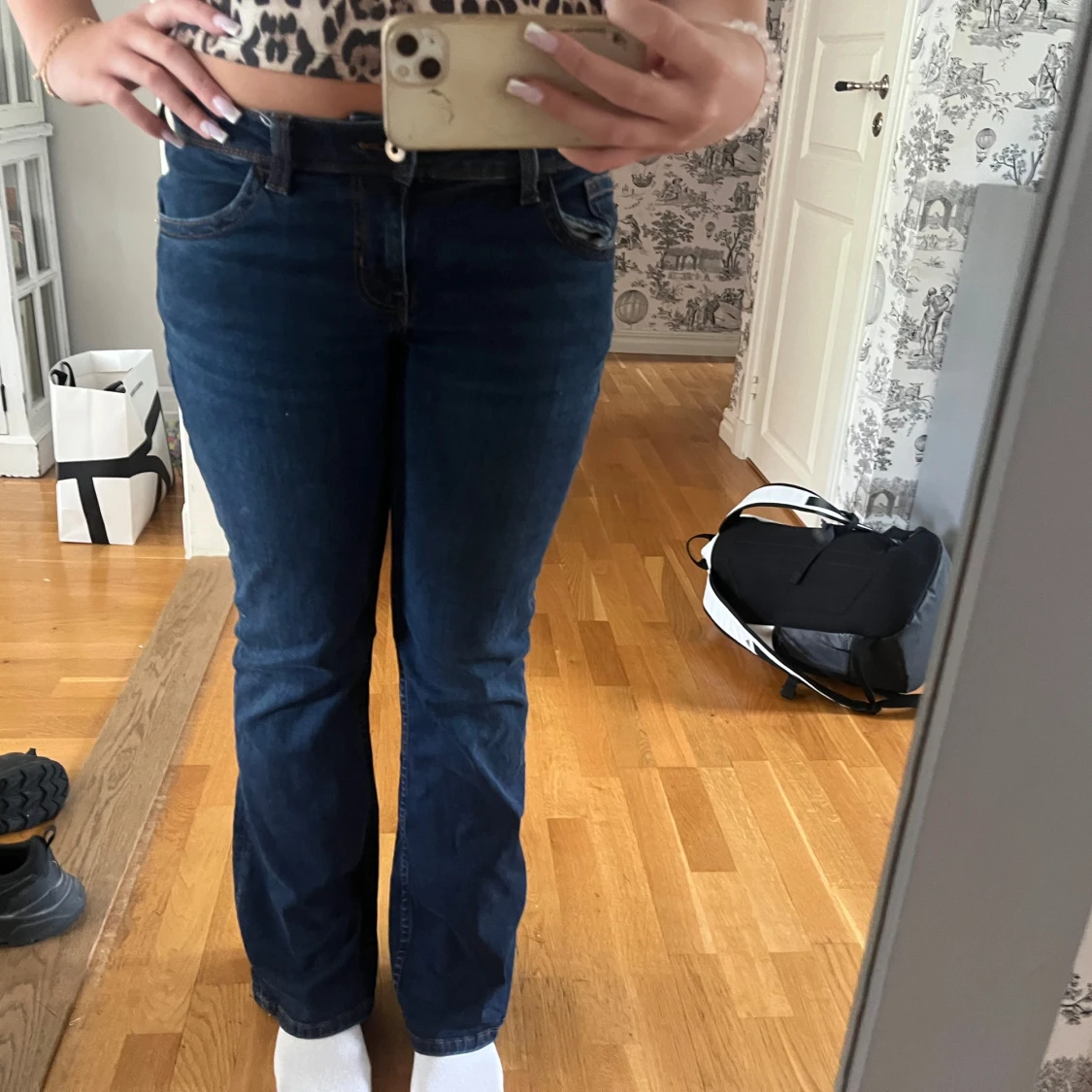 Säljer ett par mörkblå jeans med bootcut-modell och klassiska fickor både fram och bak. Jeansen har låg midja och snygga kontrastsömmar på bakfickorna. Köpta från hm i storlek 40 men sitter mer som 38. Pris kan diskuteras!
