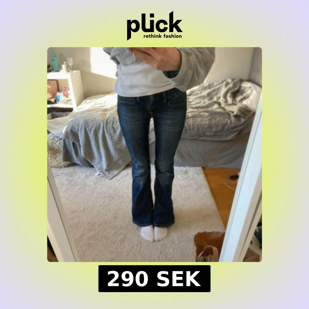 Snygga mörkblå bootcut jeans med klassisk femficksdesign. Perfekta för en avslappnad stil och passar bra med sneakers eller stövlar. Jättesnygga detaljer. Lågmidjade