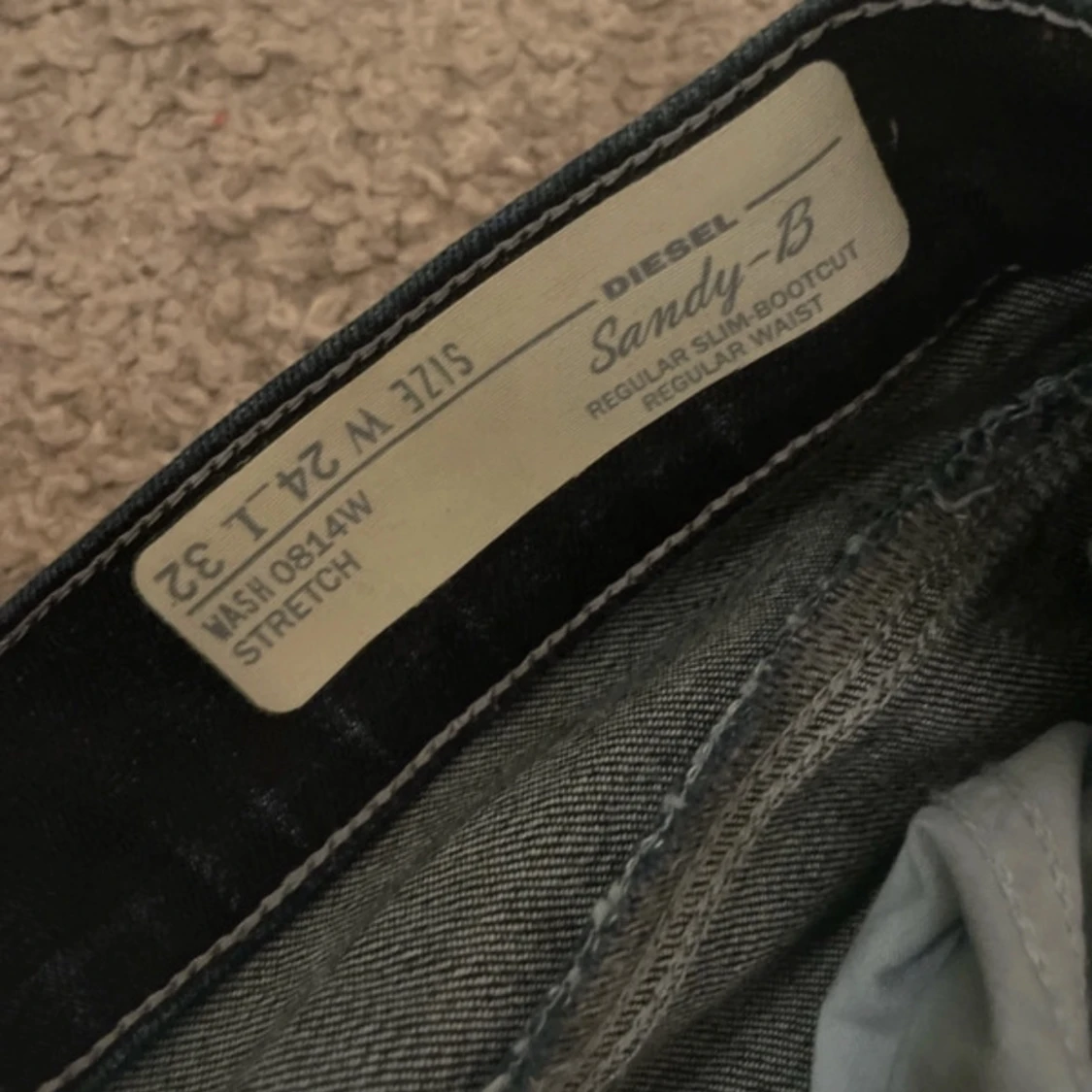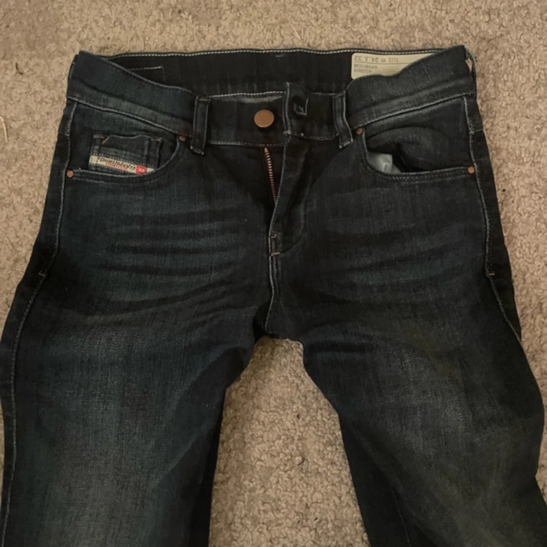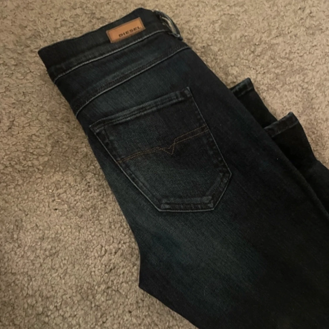 Snygga mörkblå bootcut jeans från Diesel med stretch. De har en klassisk femficksdesign och en knappgylf. Perfekta för en avslappnad stil med en touch av retro. 33-36 rakt över (stretch) och de är 32 i längd!