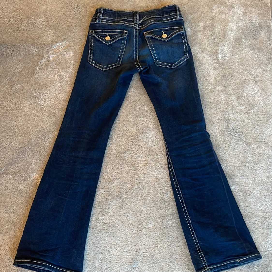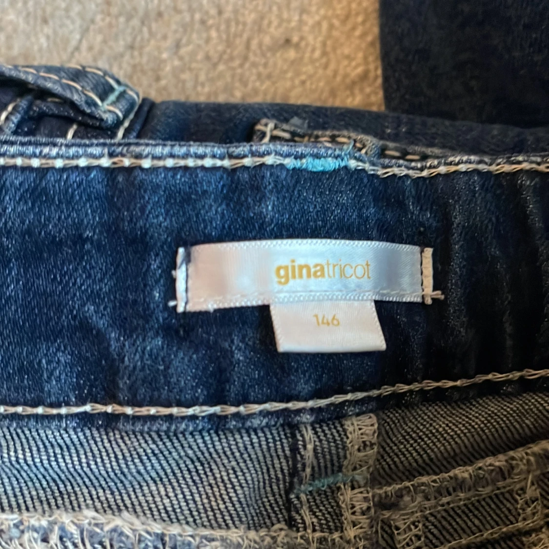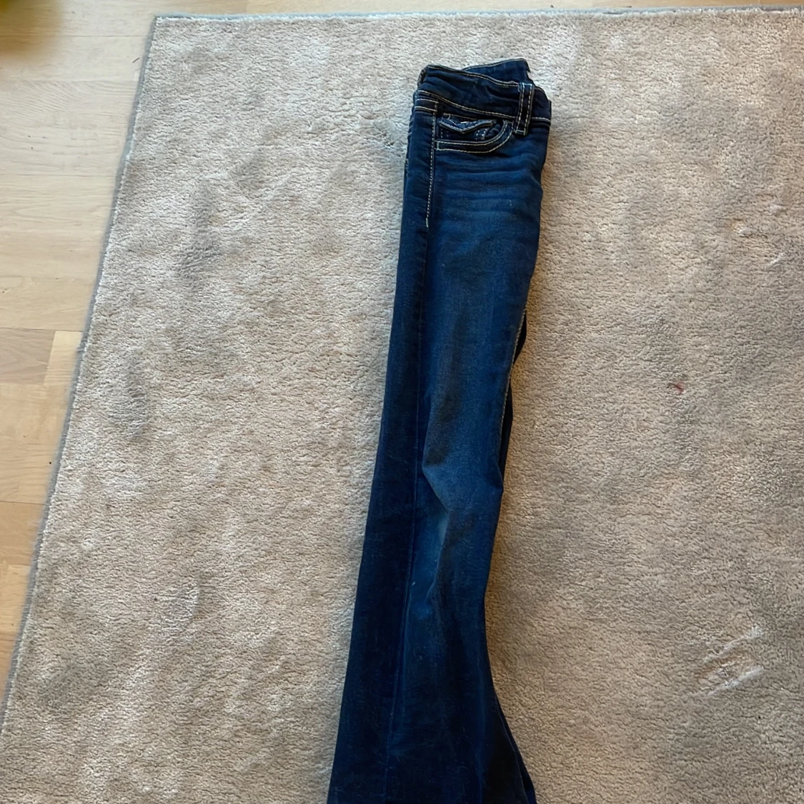 Snygga mörkblå bootcut jeans från Gina Tricot med kontrastsömmar. Klassisk femficksdesign och knappstängning. Perfekta för en avslappnad stil. Säljer de för att de är försmå!