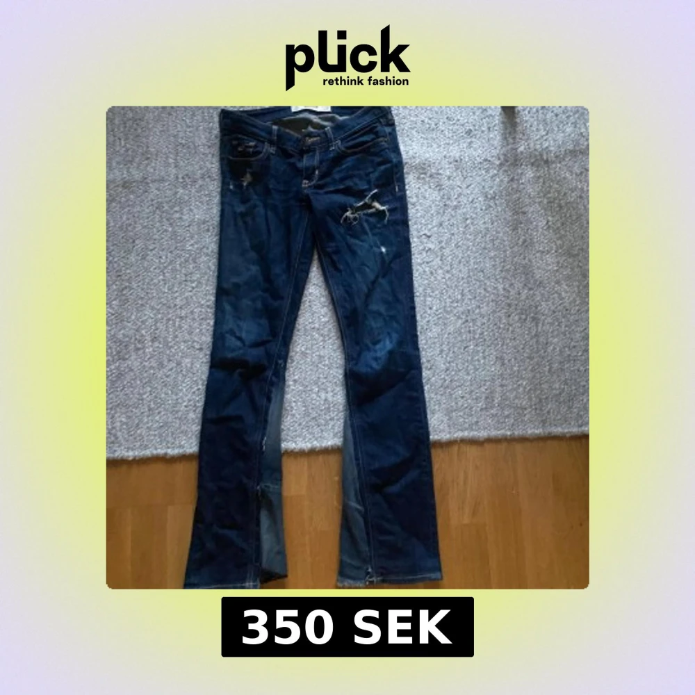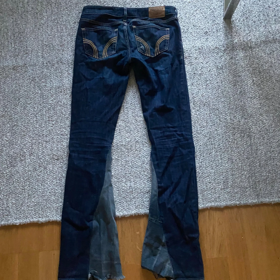Säljer ett par mörkblå jeans från Hollister med bootcut passform. Jeansen har slitna detaljer framtill och klassiska bakfickor med broderade sömmar. Tillverkade i jeansmaterial med låg midja och snygg tvätt.