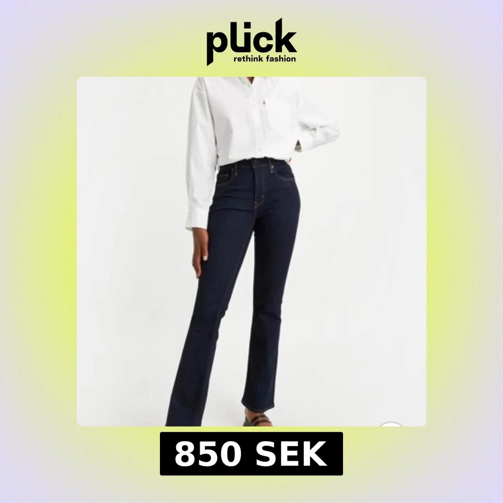 Säljer ett par mörkblå bootcut jeans från Levi's med klassisk femficksdesign och hög midja. Jeansen har en snygg passform som sitter tight upptill och släpper ut vid bensluten. Perfekta till både sneakers och boots. Använd max 3-5 gånger. Storlek 26, passar mig som är 165cm Modell: 725 high rise bootcut blue wav