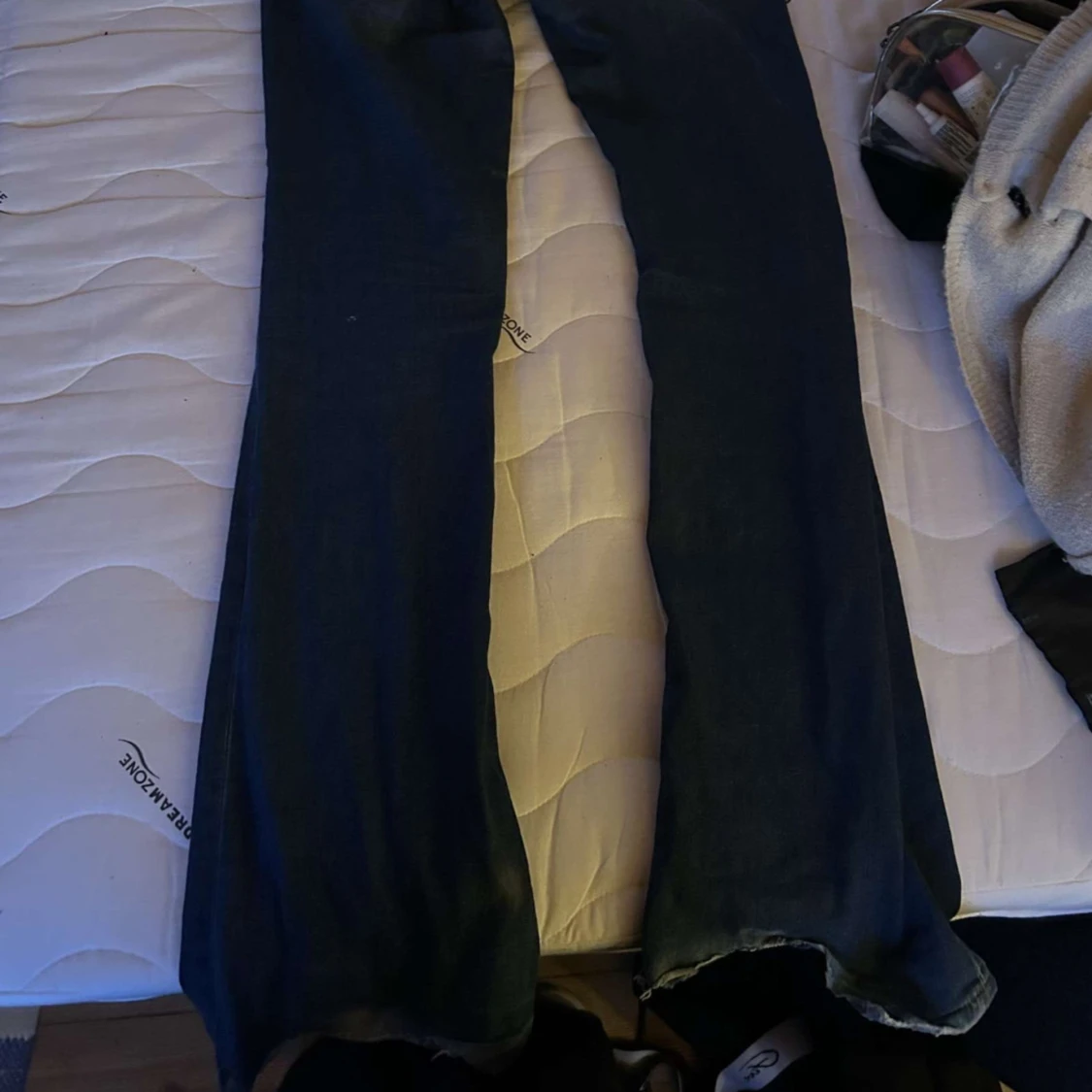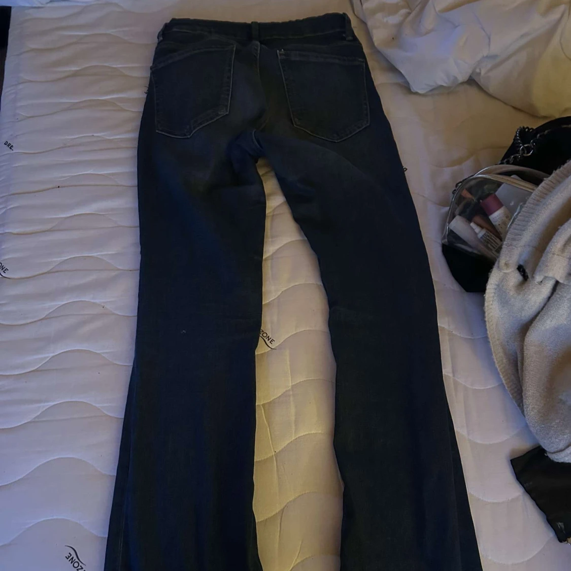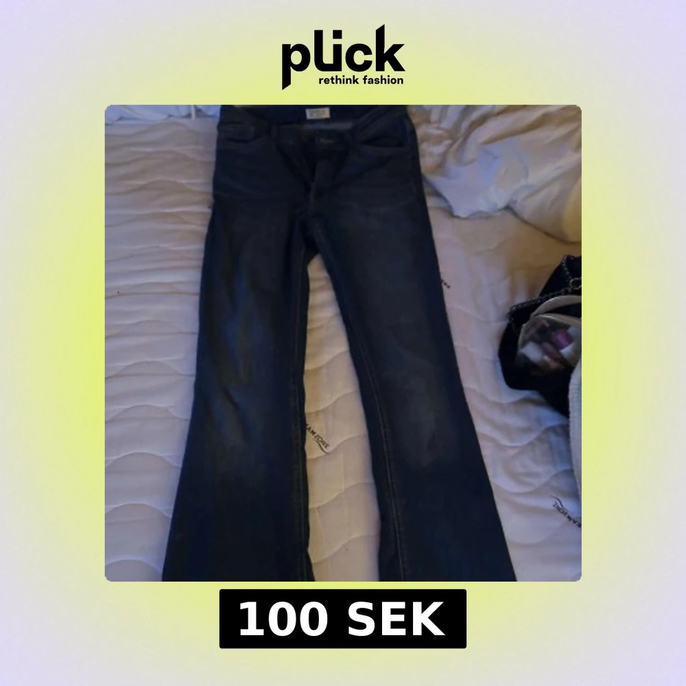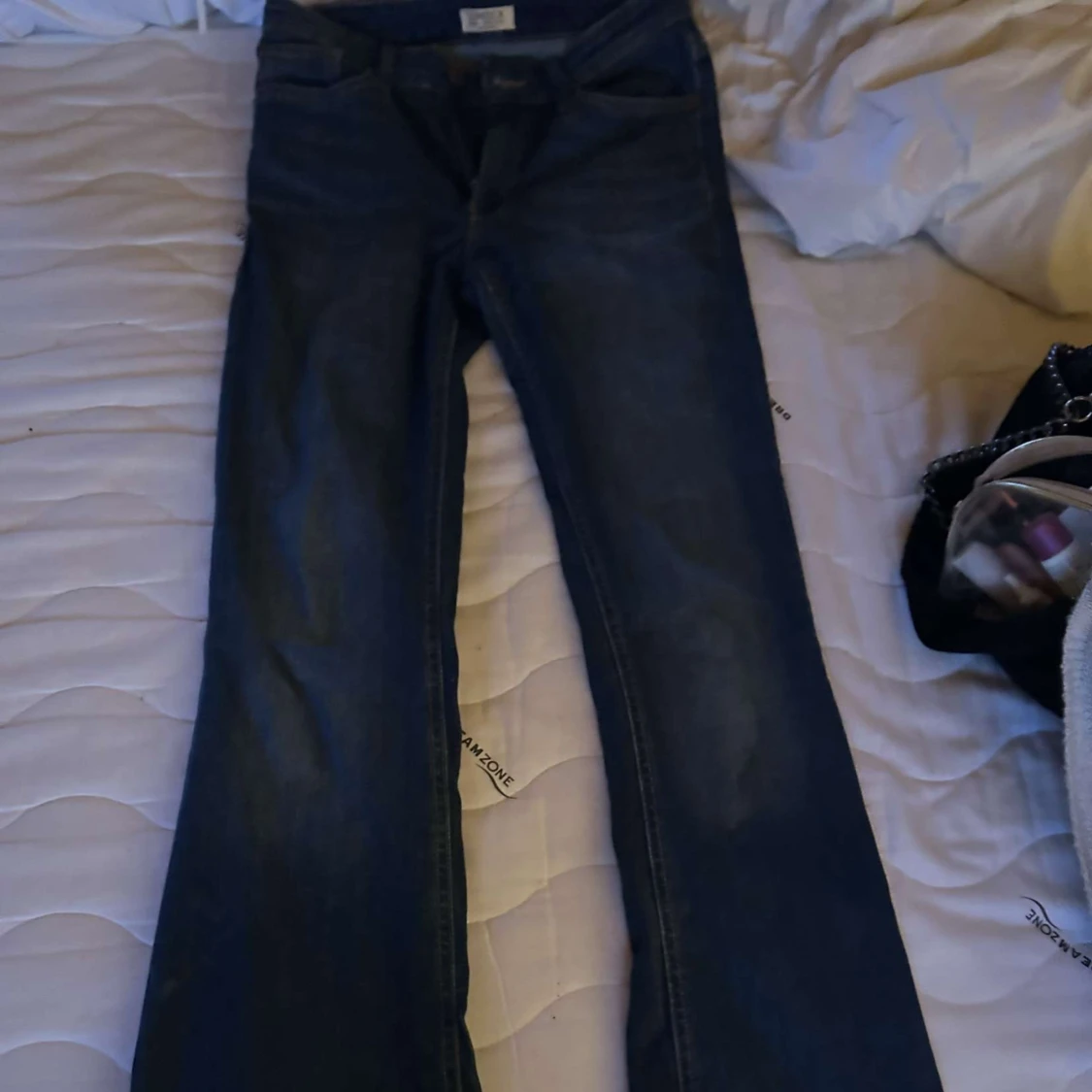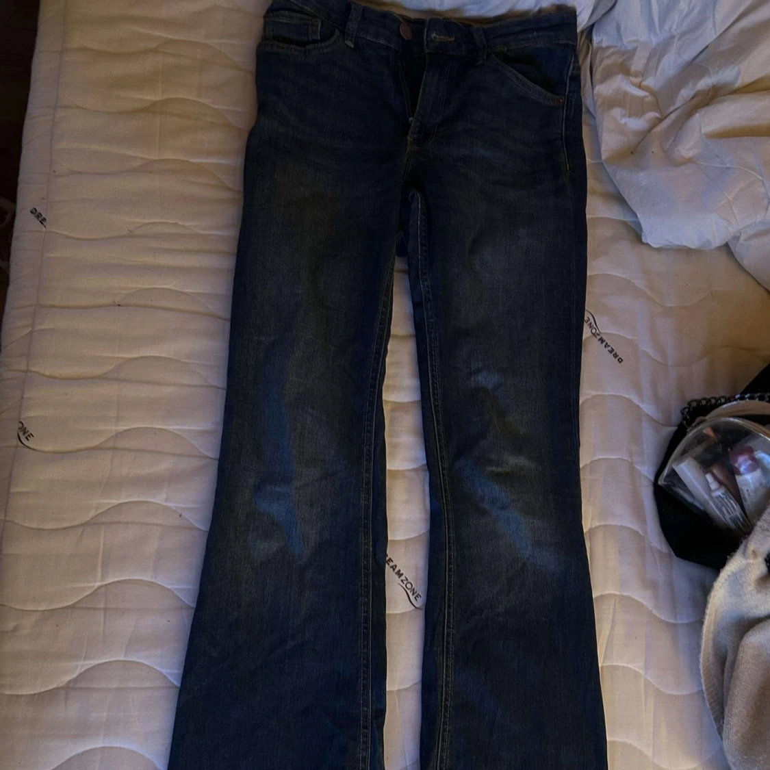 Snygga mörkblå jeans från Lindex i klassisk bootcut-modell. Jeansen har fem fickor, normal passform och är tillverkade i mjukt denimtyg. Perfekta för dig som gillar en tidlös look med lite utsvängda ben. Dom är jätte fin färg. Lite slitna längst ner men det är inte super synligt.