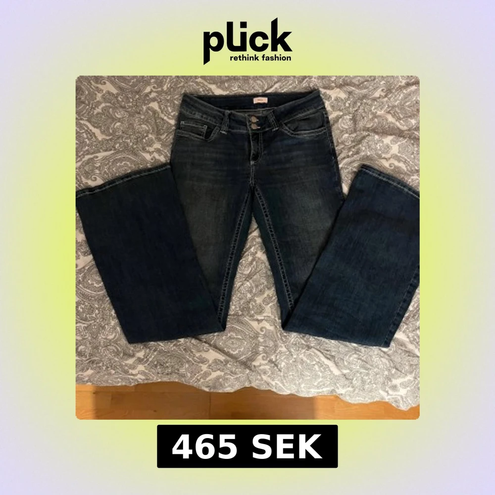Snygga mörkblå bootcut jeans från Nelly med dekorativa sömmar på bakfickorna. Jeansen har en låg midja och stängs med två knappar.