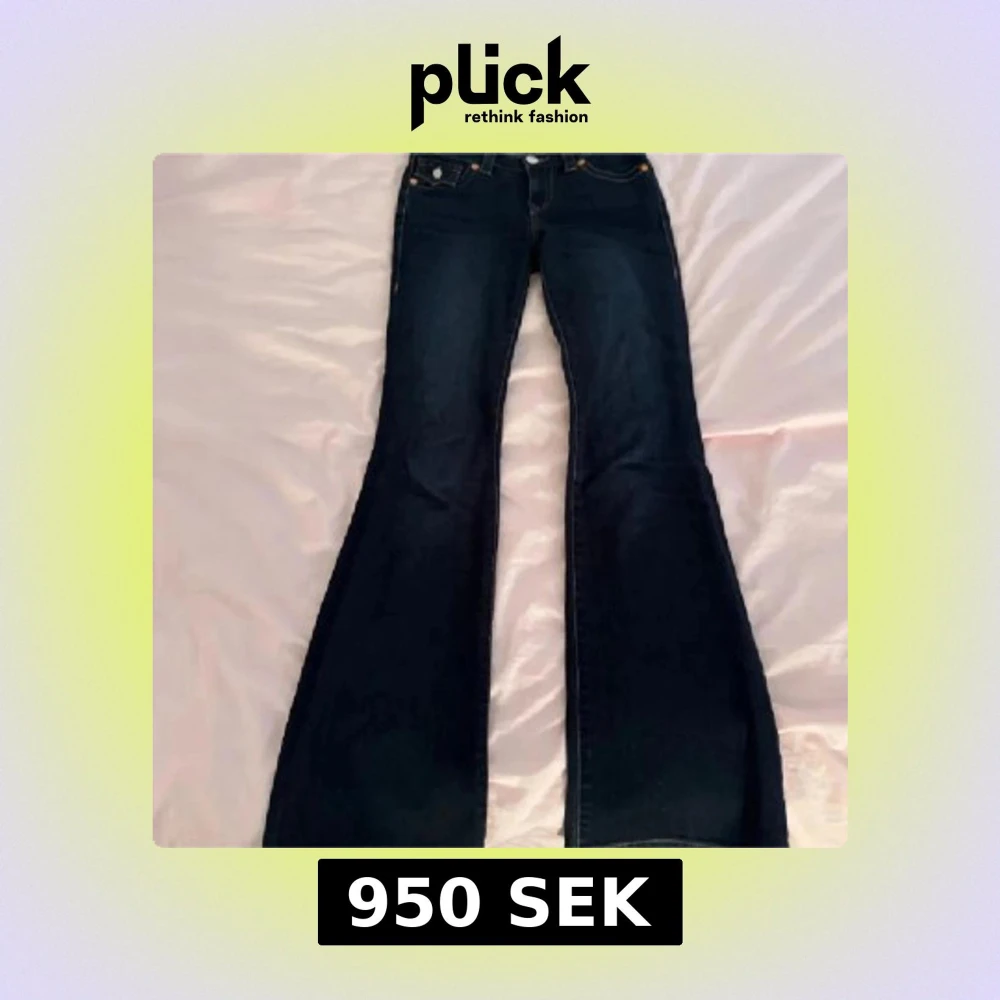 Snygga mörkblå bootcut jeans från True Religion med klassisk femficksdesign och märkets ikoniska broderade bakfickor. Jeansen har en låg midja och är perfekta för en avslappnad stil. De har orange kontrastsömmar och en patch med logotyp baktill.