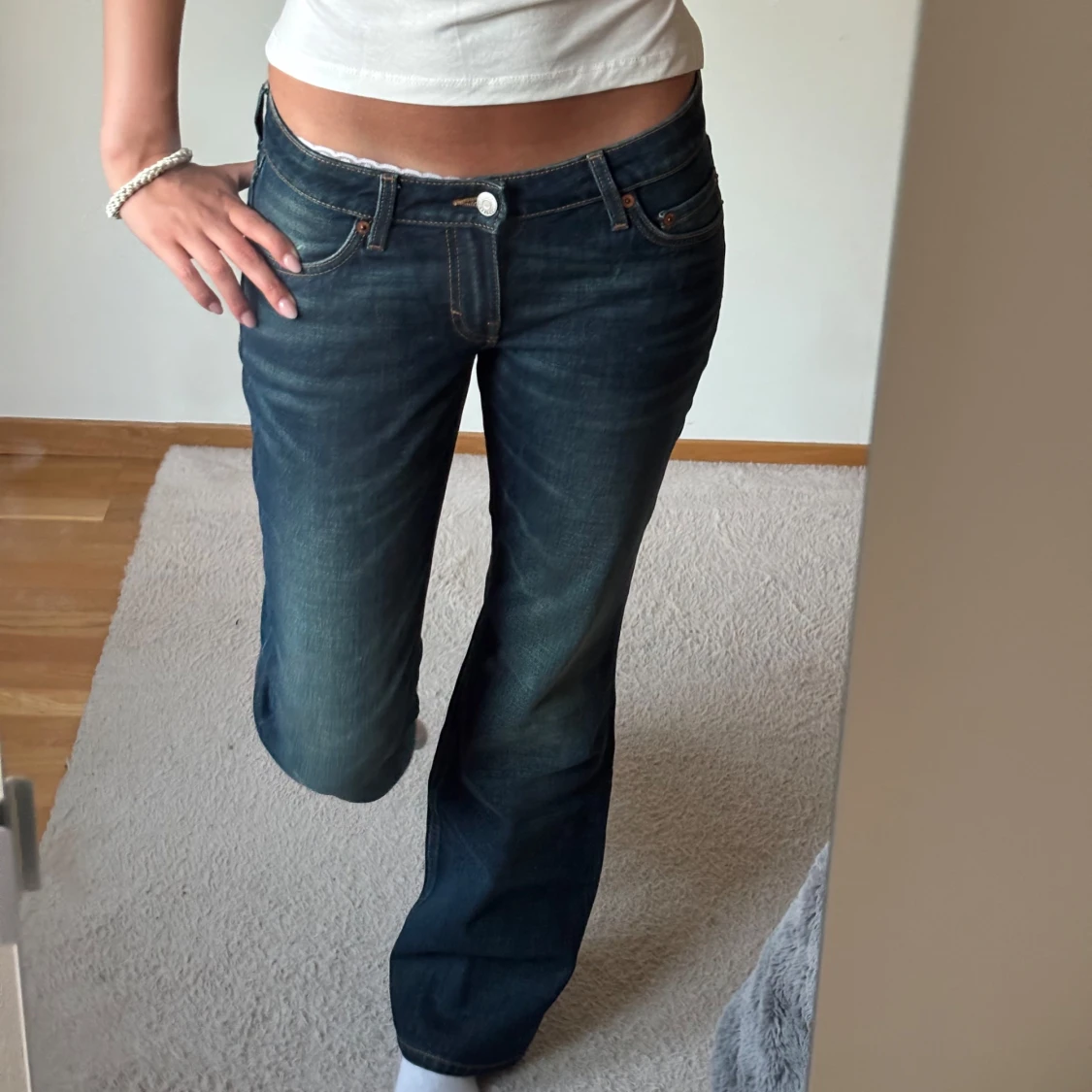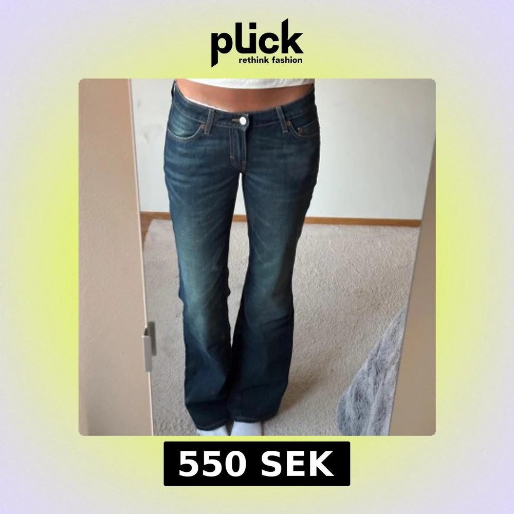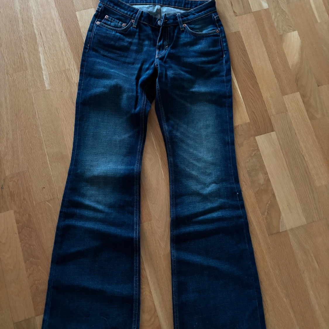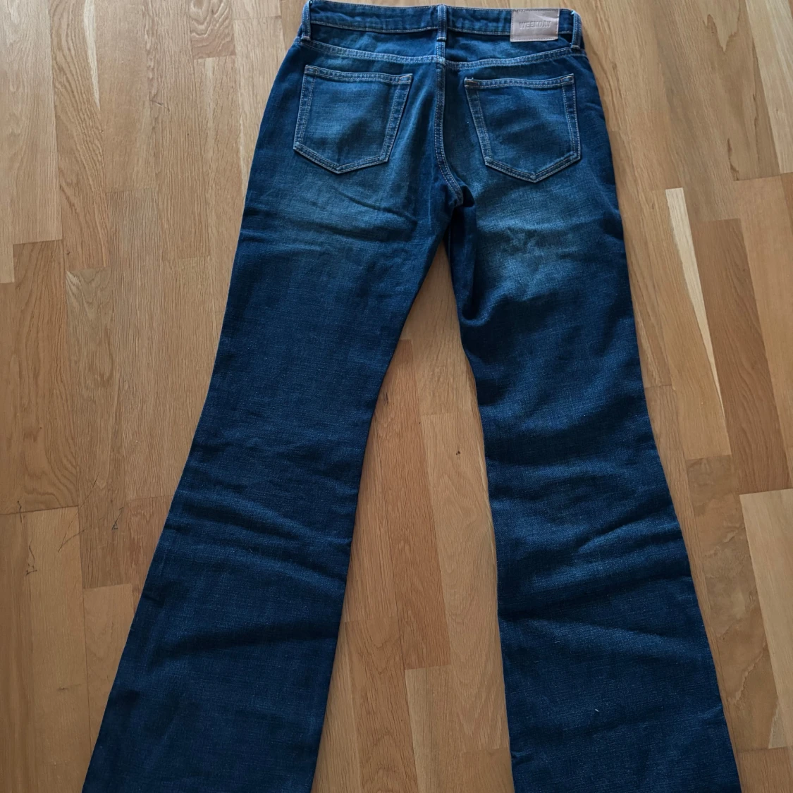 Snygga mörkblå jeans från Weekday med bootcut passform och klassisk femficksdesign. Jeansen har en lätt tvättad look med slitningar framtill och bakfickor med Weekday-logga. Perfekta för dig som gillar en retro vibe och vill ha ett par jeans med lite vidare ben. Midja: 37 cm (rakt över), 46 cm (rakt över) och innerbenslängd: 83 cm. Jeansen är i Style: Nova Low Slim Bootcut Jeans och i storlek W27 L34. Varan är använd ett fåtal gånger!