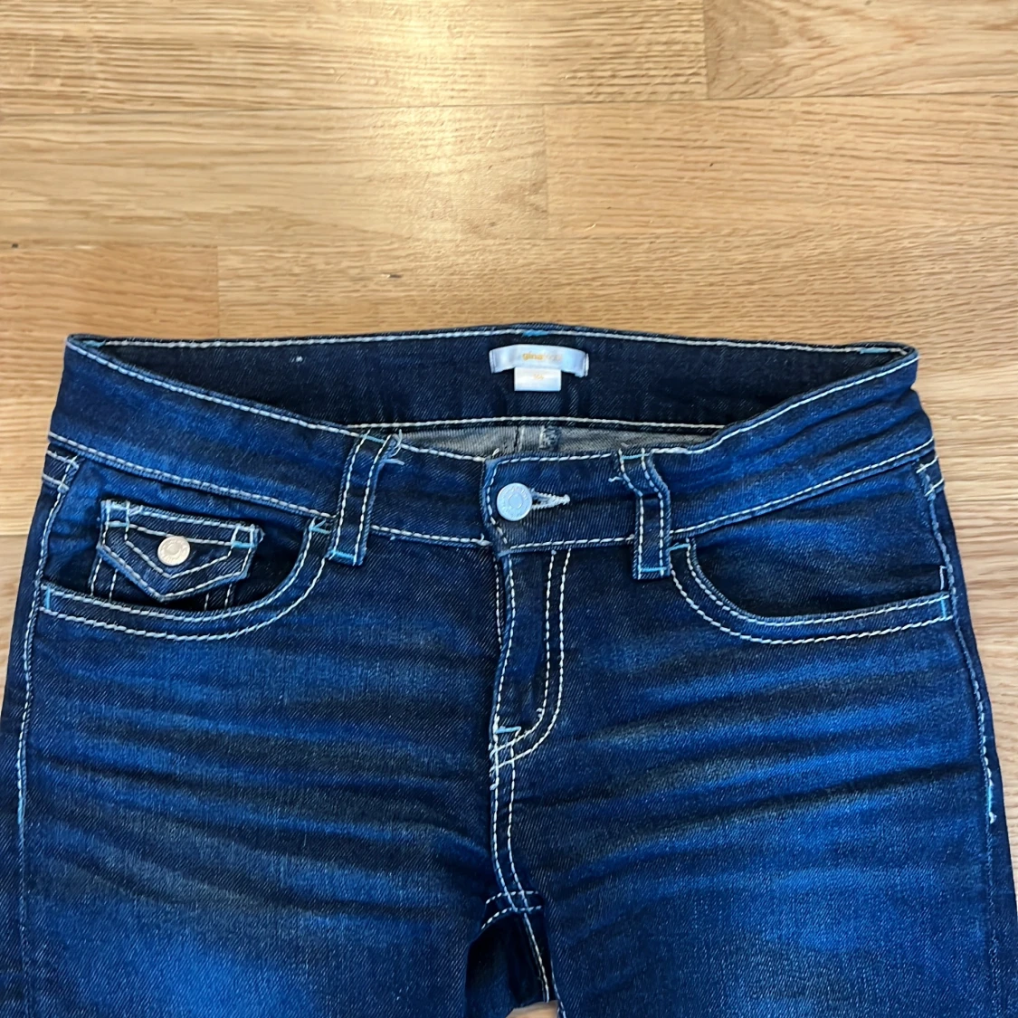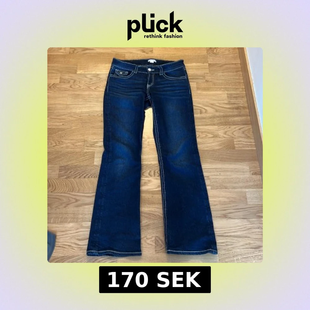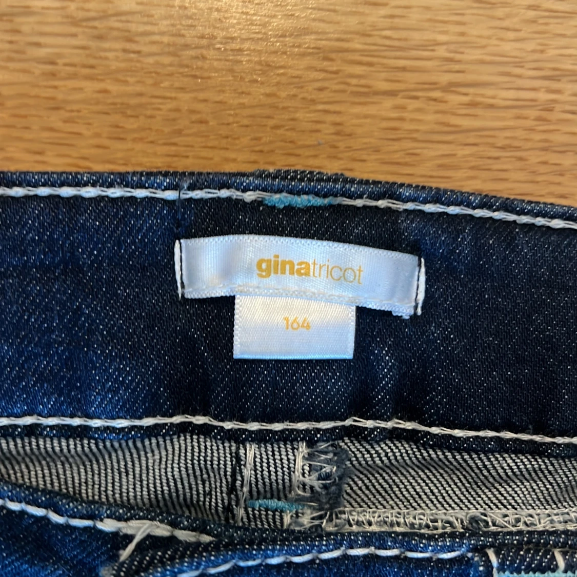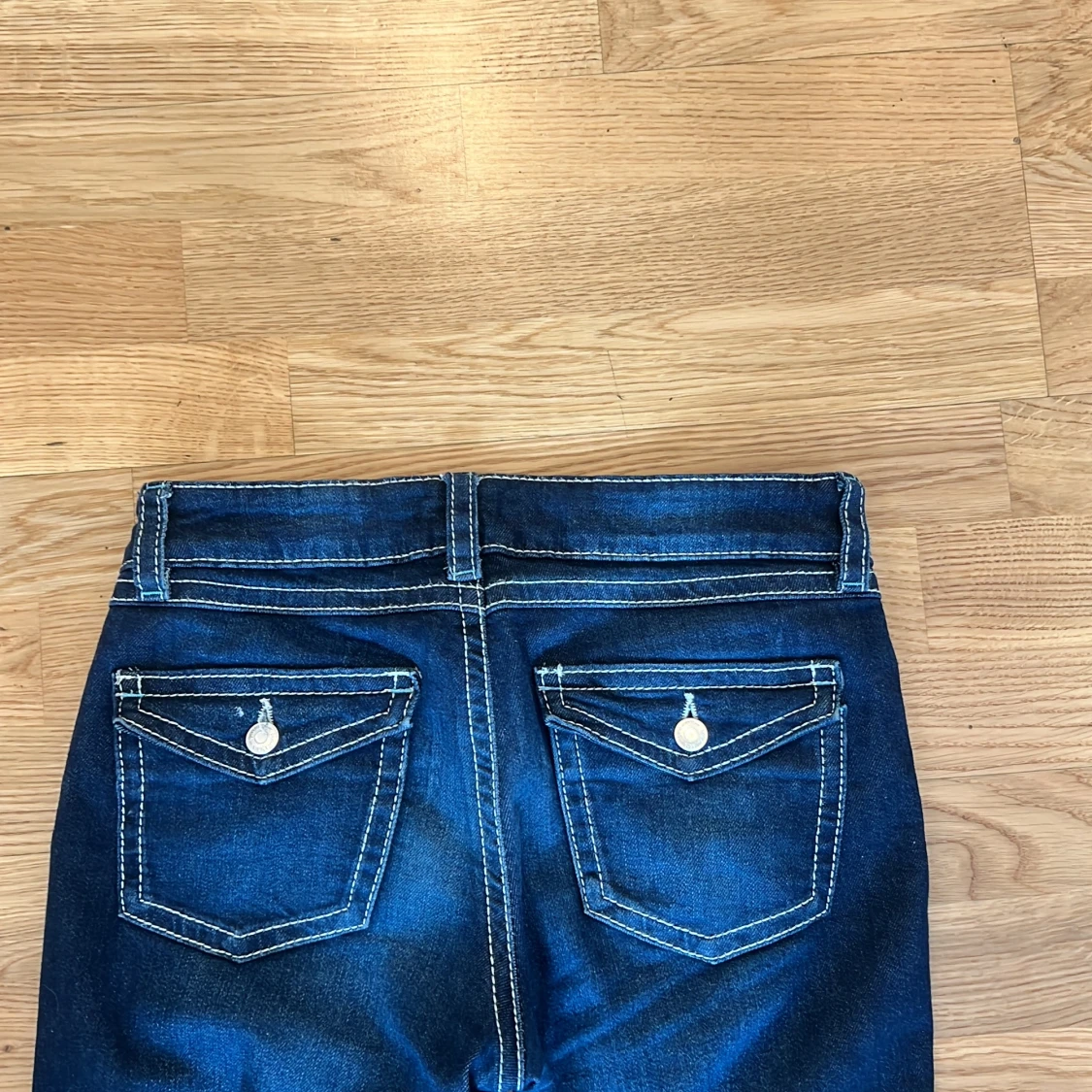 Snygga mörkblå jeans från Gina Tricot i bootcut-modell med kontrasterande vita sömmar. Klassisk femficksdesign med lock på bakfickorna och knappdetaljer. Jeansen har låg midja och är tillverkade i stretchig denim för skön passform.