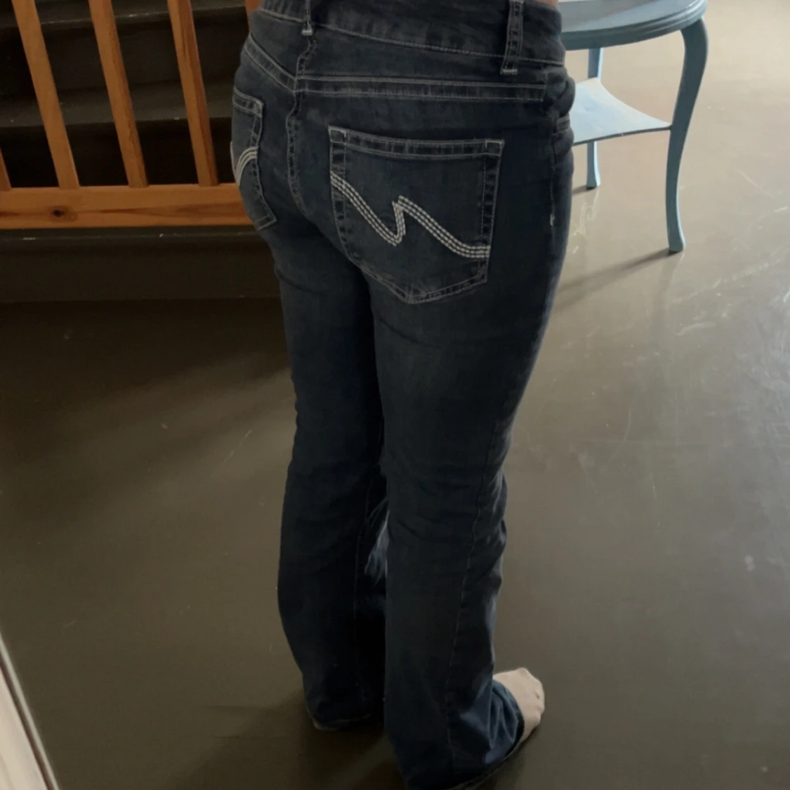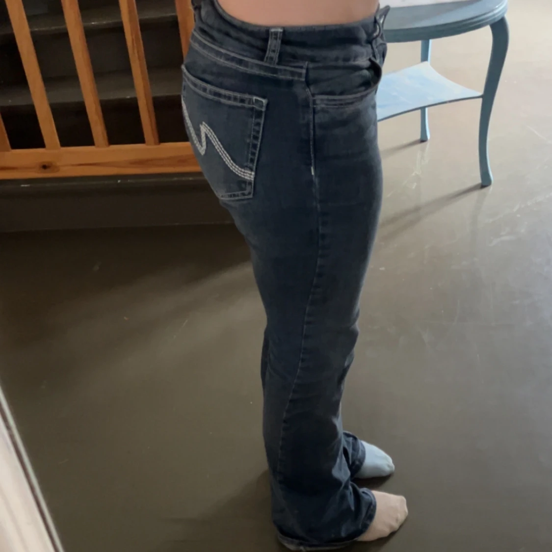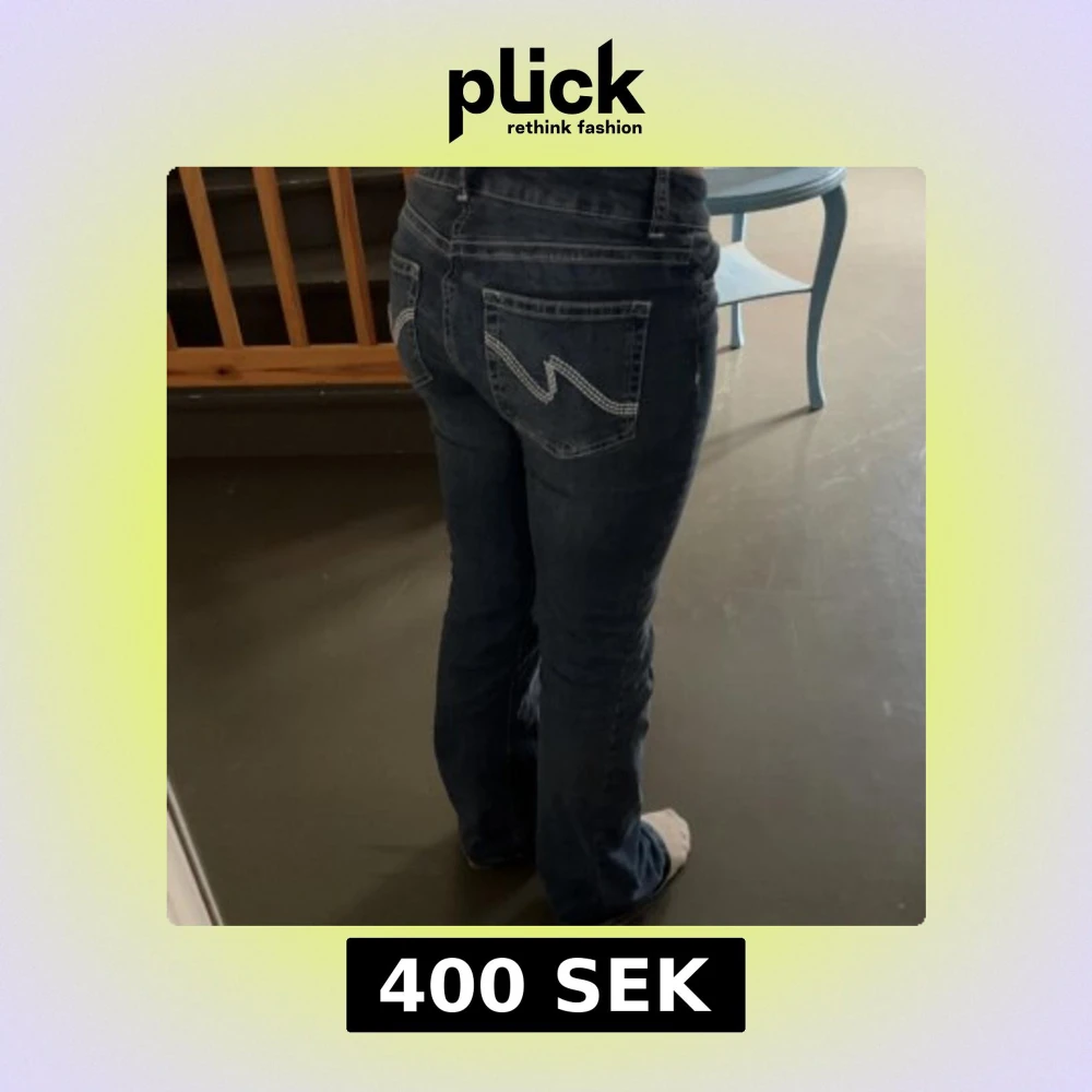 Säljer ett par mörkblå jeans med bootcut-modell och snygga broderade detaljer på bakfickorna. Jeansen har låg midja och klassisk femficksdesign. Perfekta för dig som gillar en tidlös och avslappnad look.