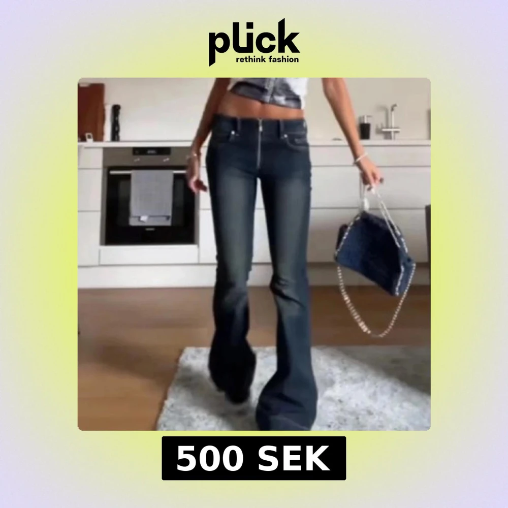 Snygga mörkblå jeans med bootcut passform och markerad dragkedja framtill, från weekday och enbart lite slitningar längst ner där bak
