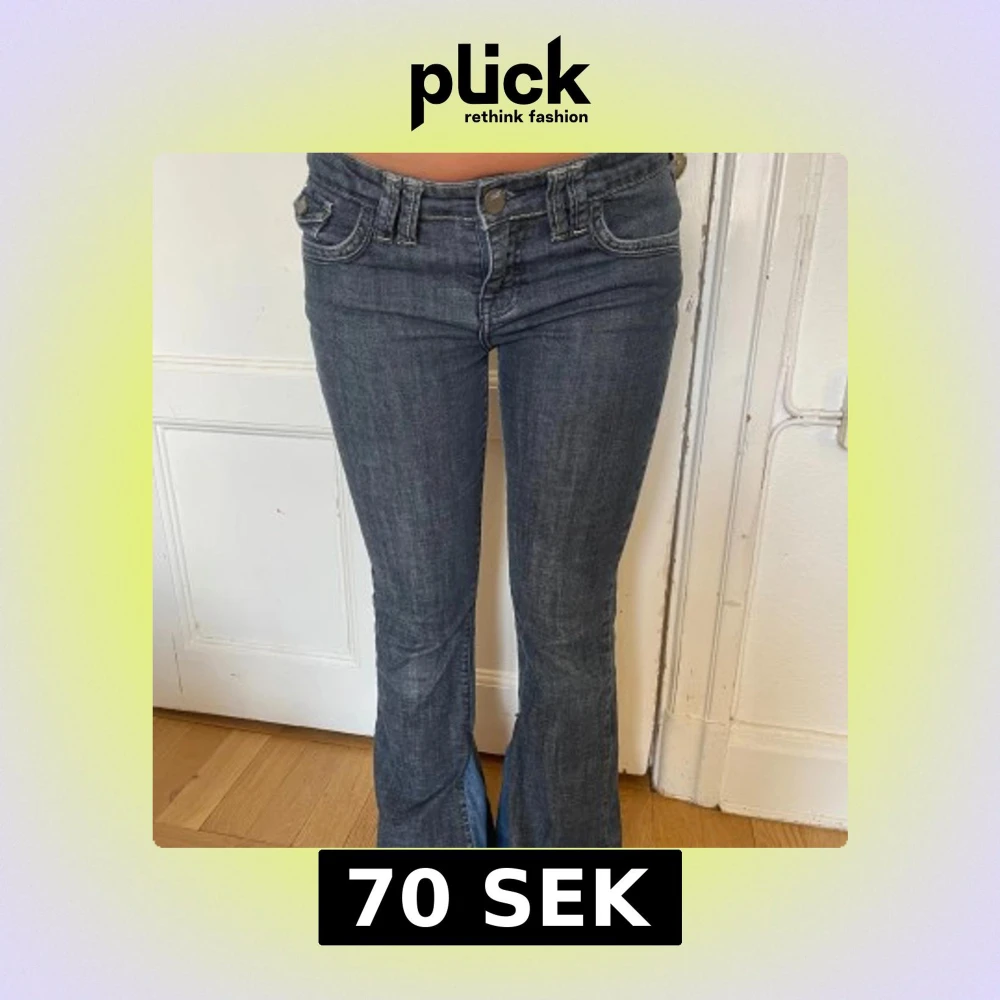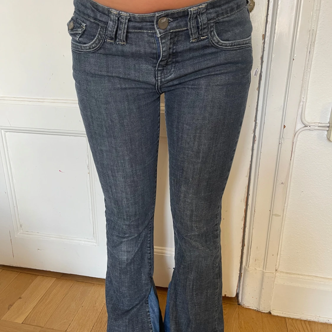 Snygga mörkblå jeans med bootcut passform och låg midja. Jeansen är omsydda vid fötterna med en annan jeans-färg!
