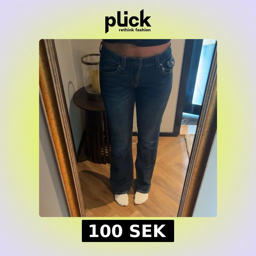 Snygga mörkblå jeans med bootcut, lågmidjade. Fickdetaljer med knapp bak. Gina young, storlek 170