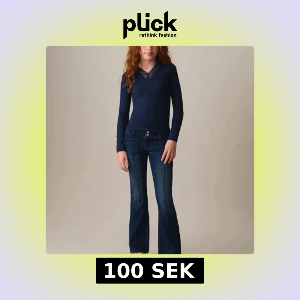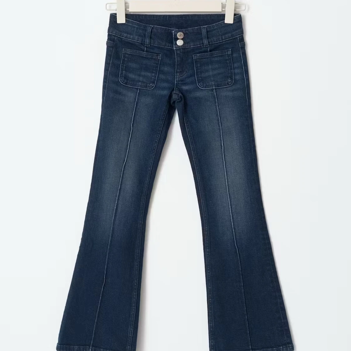 Snygga mörkblå jeans med bootcut passform och markerade sömmar längs benen. Jeansen har två stora framfickor och dubbla knappar i midjan. Perfekta för dig som gillar en klassisk men trendig look.