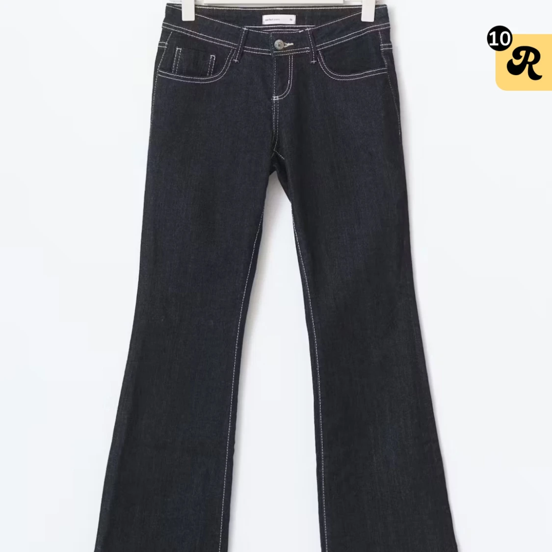 Snygga mörkblå jeans från gina tricot med bootcut passform och låg midja. Jeansen har tydliga vita kontrastsömmar, klassiska fem fickor och stängs med knapp och dragkedja. Perfekta för dig som gillar en retroinspirerad look.