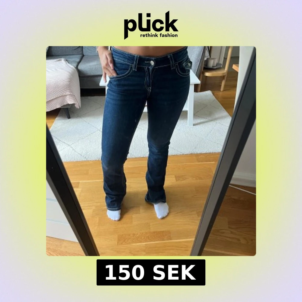 Säljer ett par mörkblå jeans med bootcut passform och tydliga vita kontrastsömmar. Jeansen har klassiska fem fickor, snygga detaljer på bakfickorna och låg midja. Perfekta för dig som gillar en tidlös men ändå trendig look.