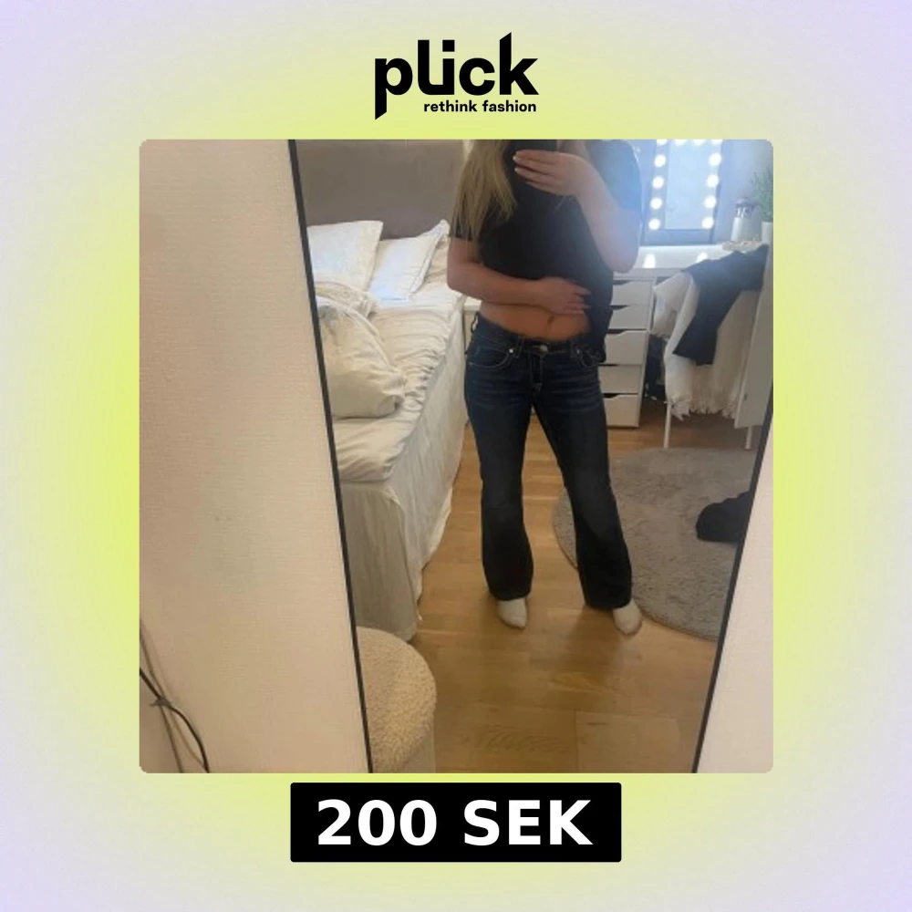 Säljer ett par mörkblå jeans med bootcut-modell och snygga kontrastsömmar. Jeansen har låg midja, klassiska fickor fram och bak samt detaljerade bakfickor med knapp. Perfekta för dig som gillar en retro vibe och vill ha ett par jeans med lite utsvängda ben.