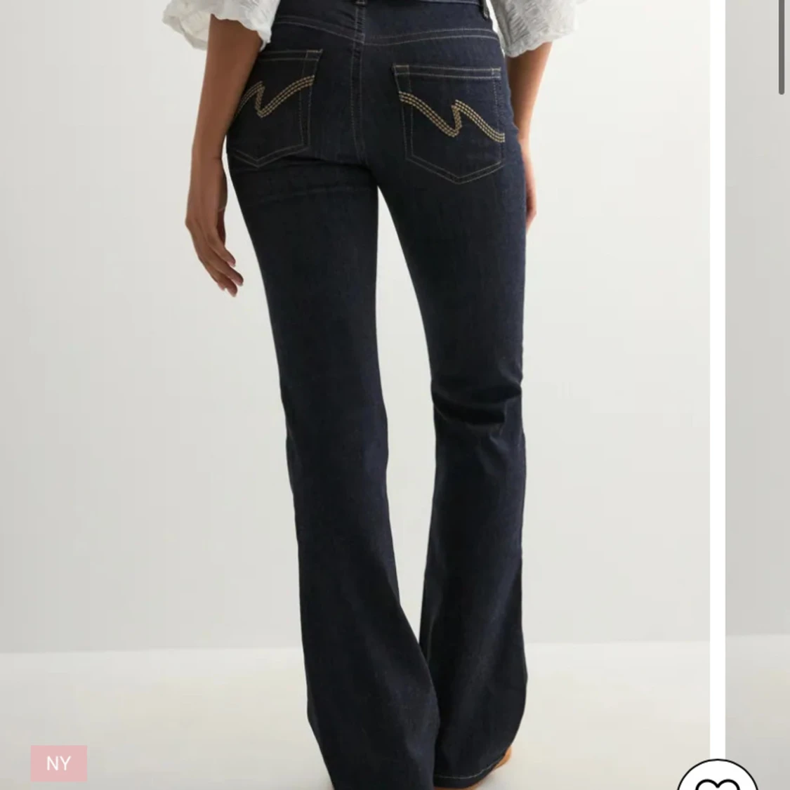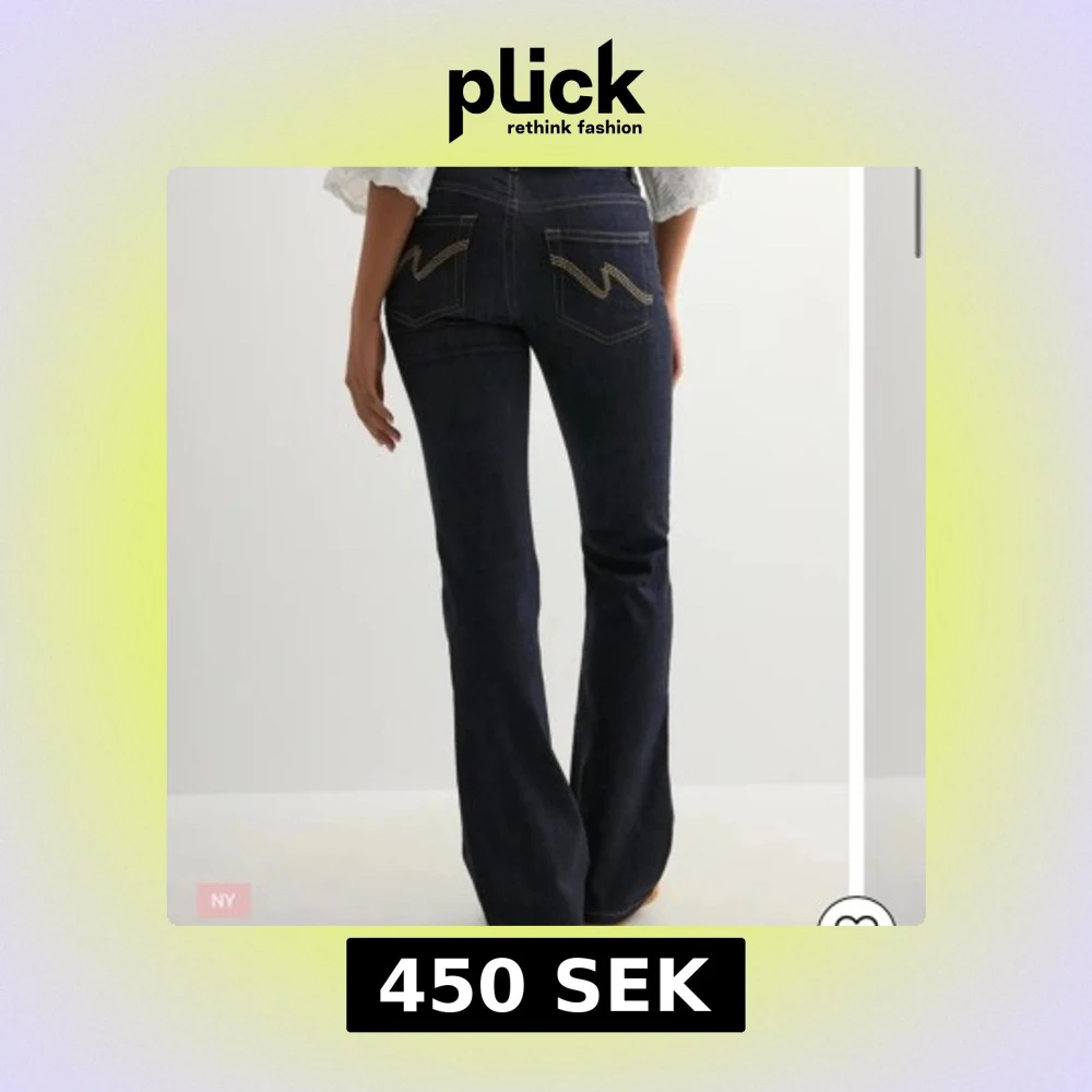 Snygga mörkblå jeans med bootcut-modell och coola kontrastsömmar på fickorna. De e klippta långst ner o innerbenslängden e ca 67cm. Använda endast en gång