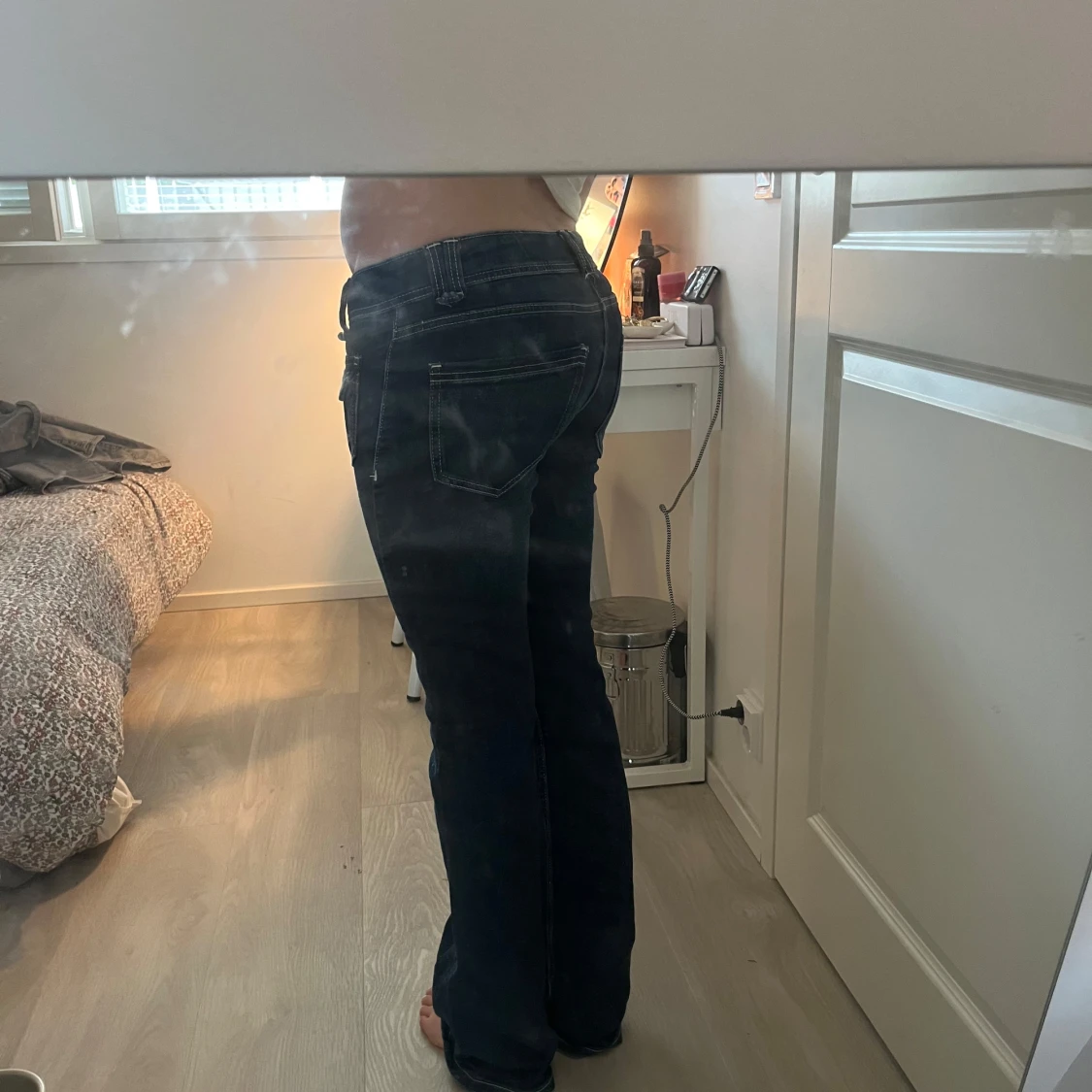 Säljer ett par mörkblå jeans med bootcut passform och snygga kontrastsömmar. Byxorna har låg midja, framfickor med lock och knappar samt klassiska bakfickor. Perfekta för dig som gillar en avslappnad men ändå trendig look.
