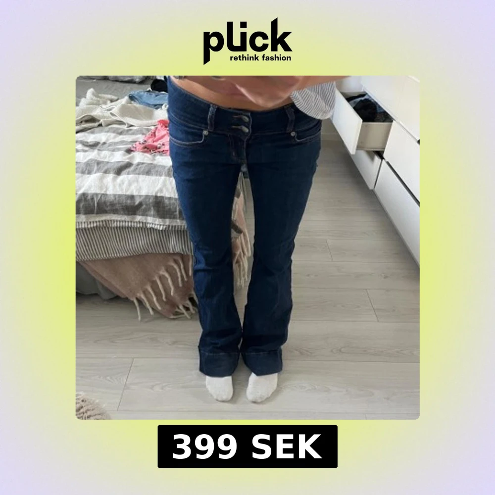 SÅ snygga mörkblå jeans med låg midja och bootcut-ben. Klassisk femficksmodell med dubbla knappar i midjan och kontrastsömmar. Jeansen är i ett mjukt denimtyg som sitter skönt. Innerbenslängd- 81 cm, midjemått- 36-39 cm.