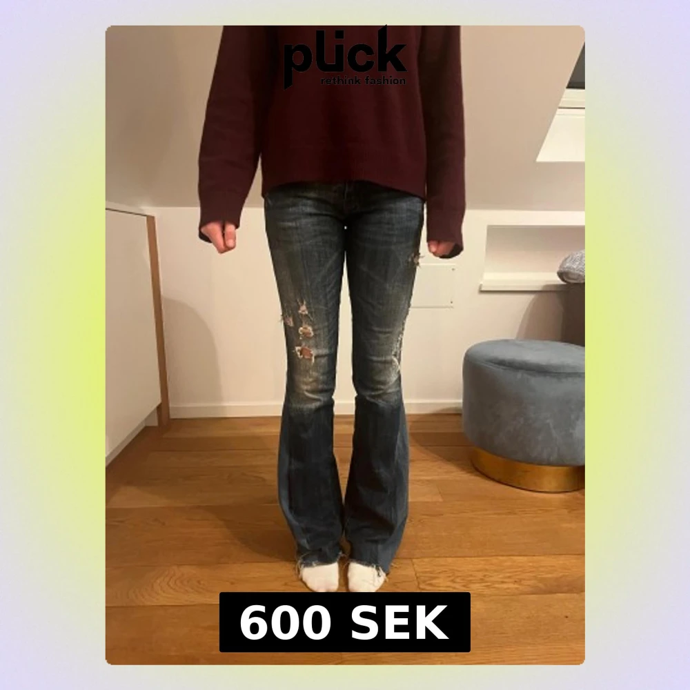 Säljer ett par mörkblå jeans från Diesel med bootcut och slitna detaljer på låren och knäna. Jeansen har låg midja, klassisk femficksmodell och fransade benslut. Materialet är denim och passformen är normal med utsvängda ben. Stl: 24/32