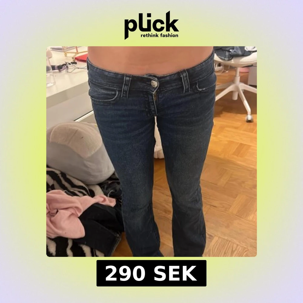Mörkblå jeans från Gina Tricot med bootcut-modell och låg midja. Jeansen har klassisk femficksdesign, snygga detaljerade bakfickor med knapp och slitningar för en cool look. Perfekta om du gillar en lite retro vibe och vill ha jeans som sitter tajt upptill och släpper vid benen.