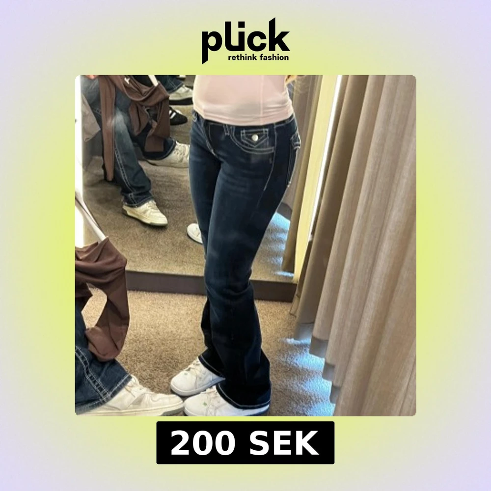 Snygga mörkblå bootcut jeans med vita sömmar och dekorativa fickor. Passar bra till vardags. Från Gina Tricot I strl 158🫶