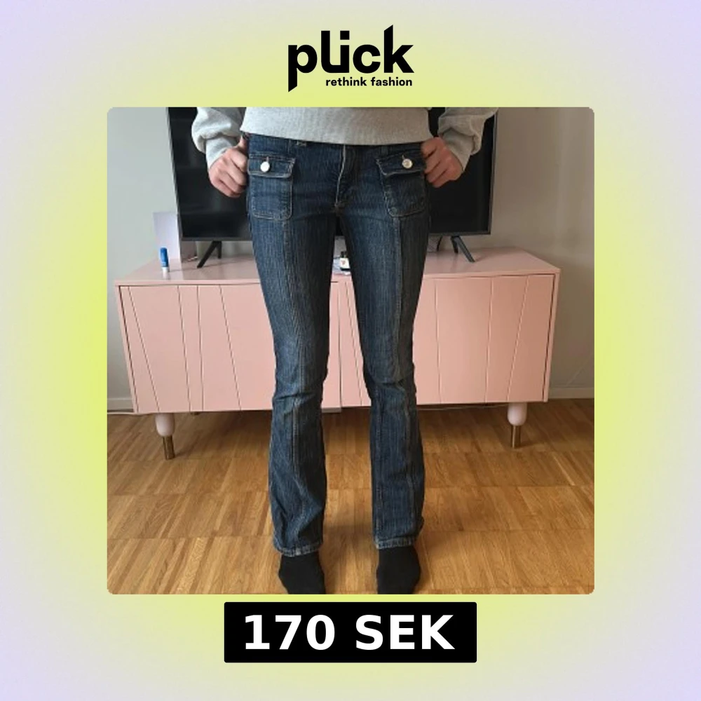 Snygga mörkblå bootcut jeans med framfickor. Köpte på h&m i st 164. Säljer pga inte så mycket använd och för små❤️