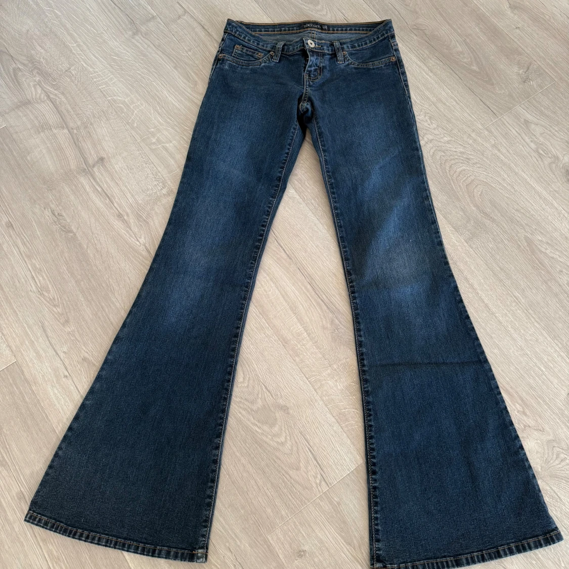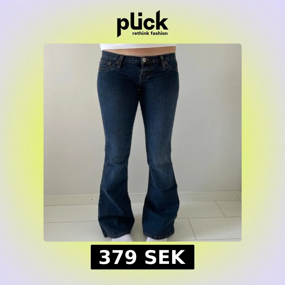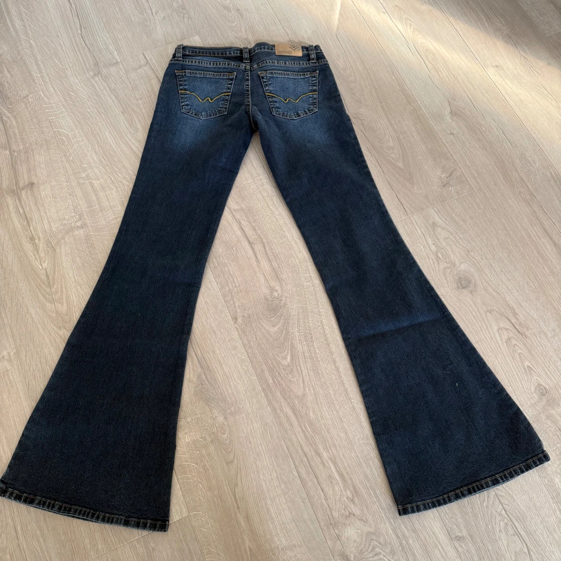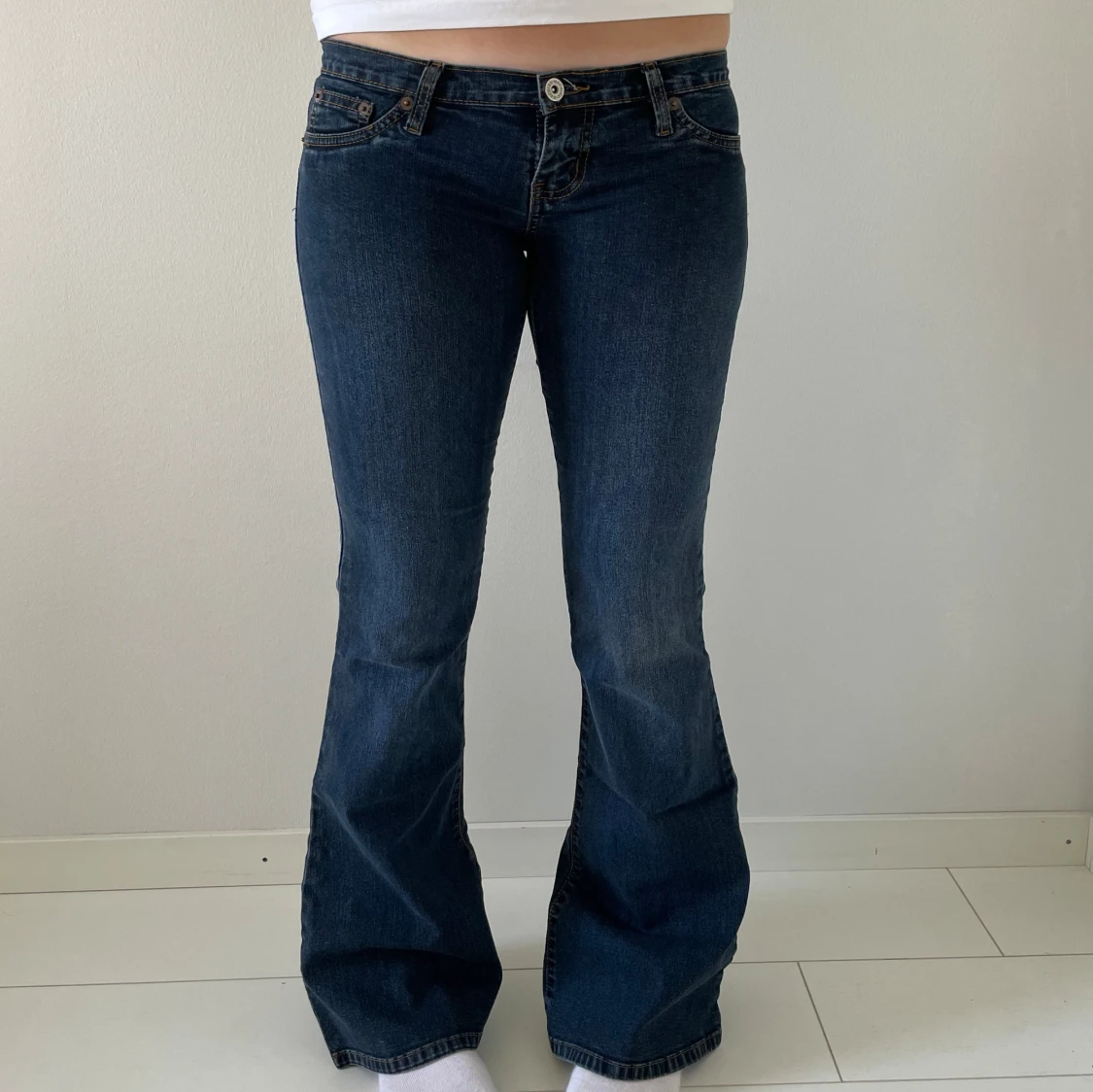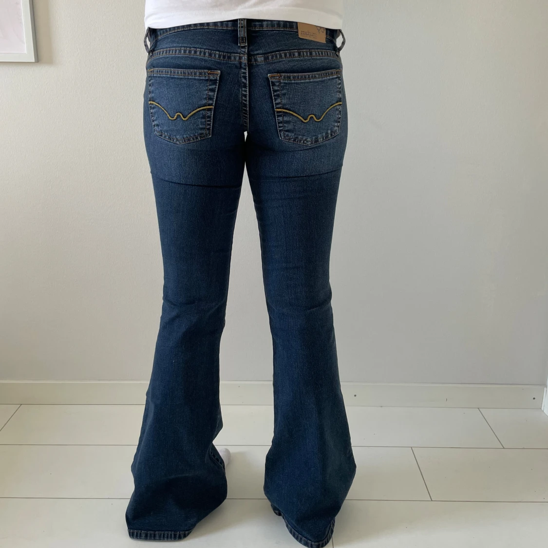 Snygga mörkblå bootcut jeans med klassiska fickor och gul söm på bakfickorna. Lågmidjade och tillverkade i stretchigt denim för en bekväm passform. Perfekta för dig som gillar retrovibbar och vill ha ett par jeans med lite utsvängda ben.