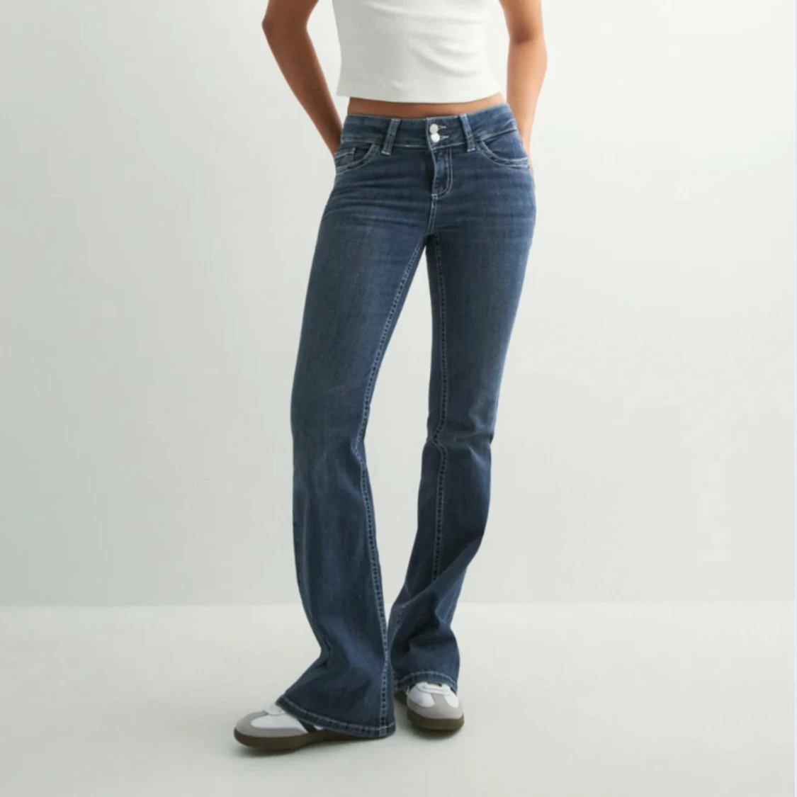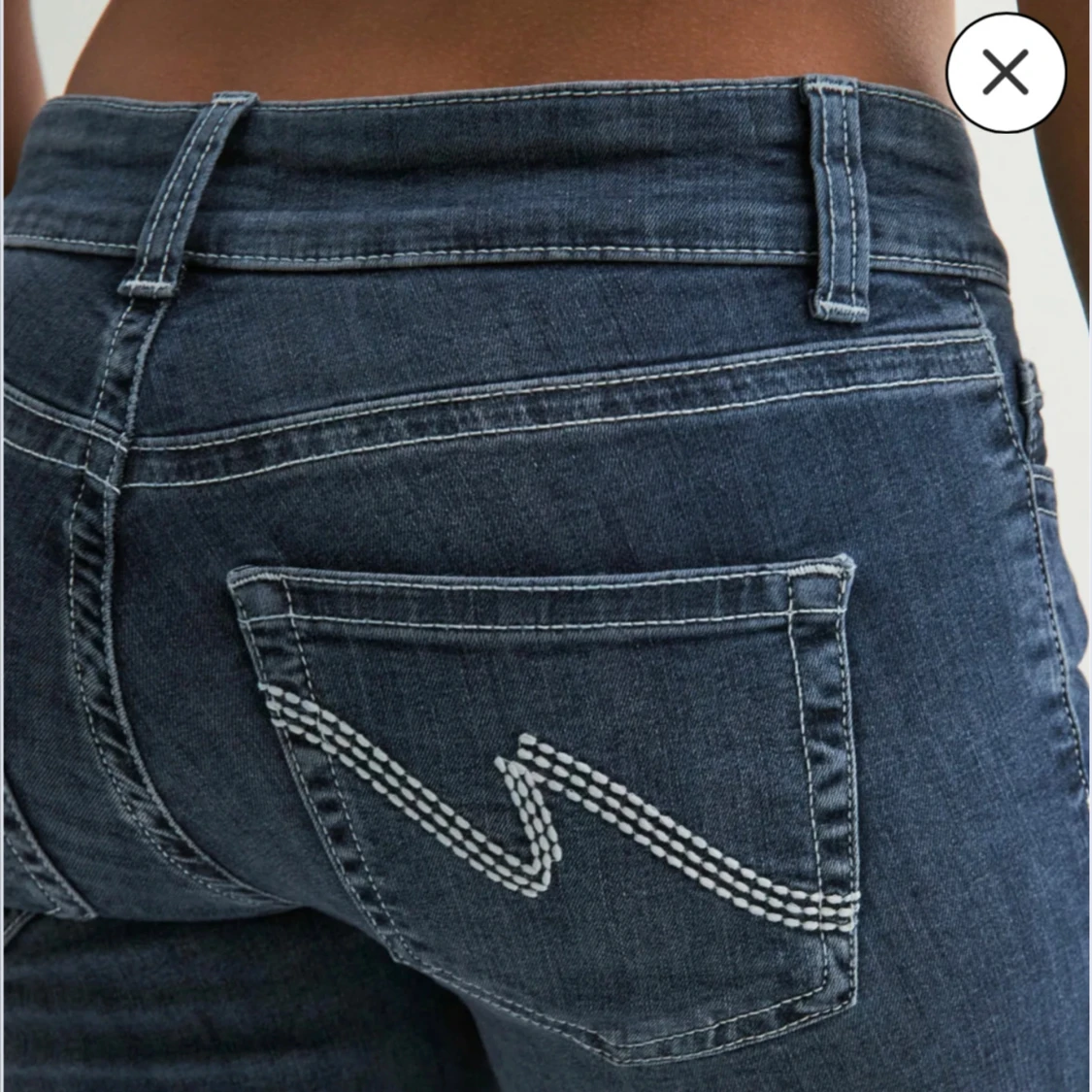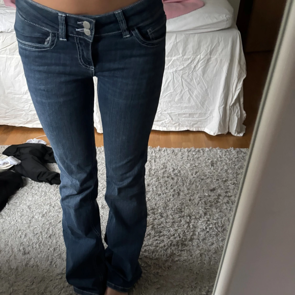 Snygga mörkblå bootcut jeans med klassisk femficksdesign och coolt broderi på bakfickan. Jeansen har låg midja, dubbla knappar fram och är gjorda i stretchigt denim för skön passform. Jag är 1,61 å är för långa för mig, liten liten slitning där nere baktill då dom är för långa för mig å slitits upp lite. Ca 66cm i midjemått men väldigt stretchiga. Använd väldigt få gånger. Nypris 699kr
