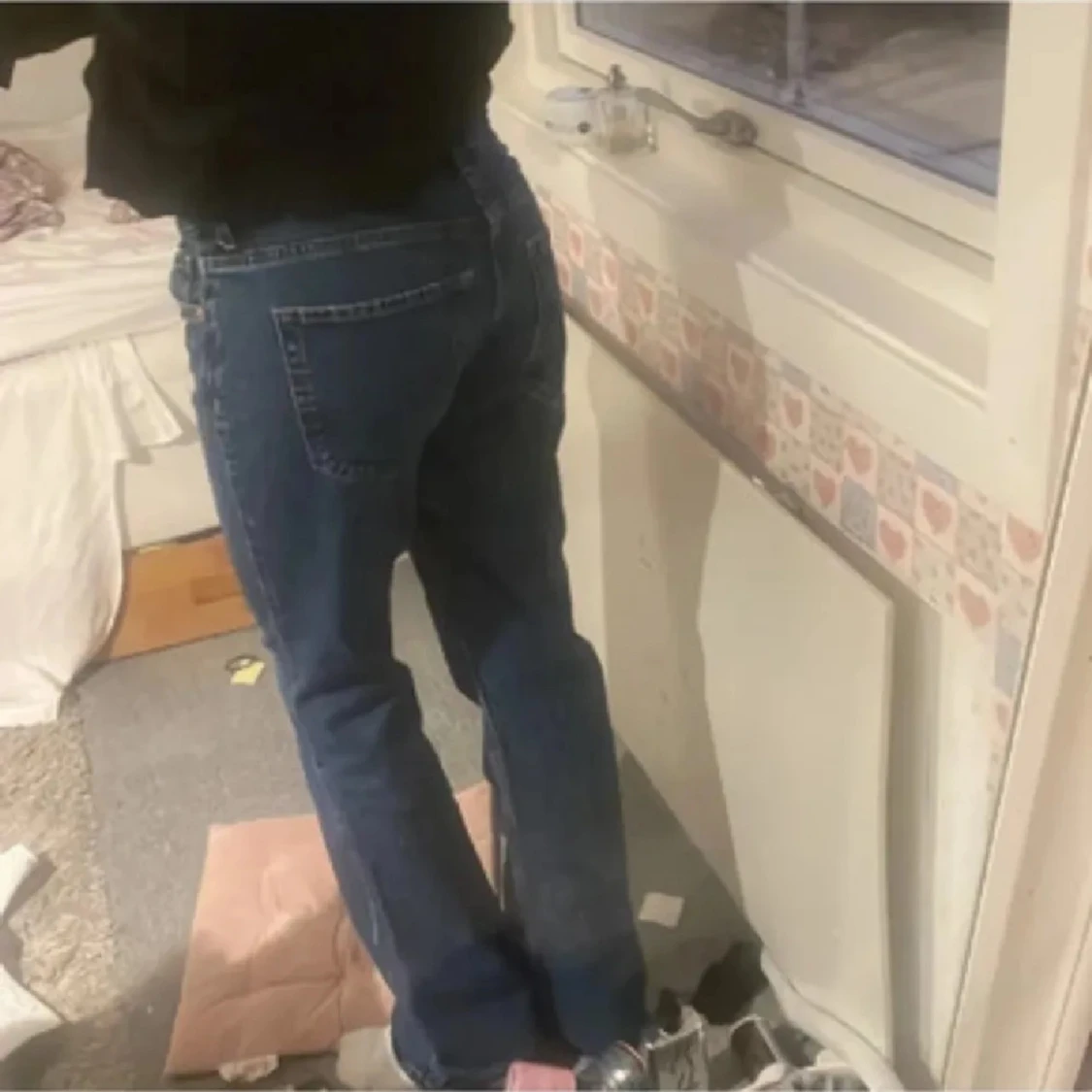 Säljer ett par klassiska mörkblå jeans från Hm med bootcut/ rak passform. Jeansen har fem fickor, silverfärgade nitar och är tillverkade i robust denim. Perfekta till sneakers eller boots för en chill look.