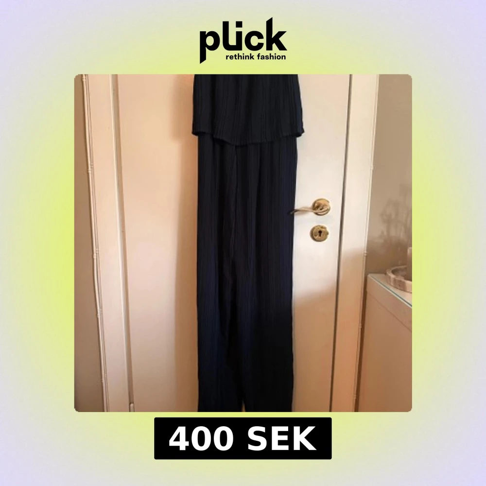 Supersnygg mörkblå byxdress från ICHI i plisserat tyg. Vida ben och flowig passform som ger en chill och trendig vibe. Perfekt för dig som gillar stilrena och bekväma plagg med det lilla extra. Resår i midjan och mjukt, lätt material. ( Har aldrig använts)