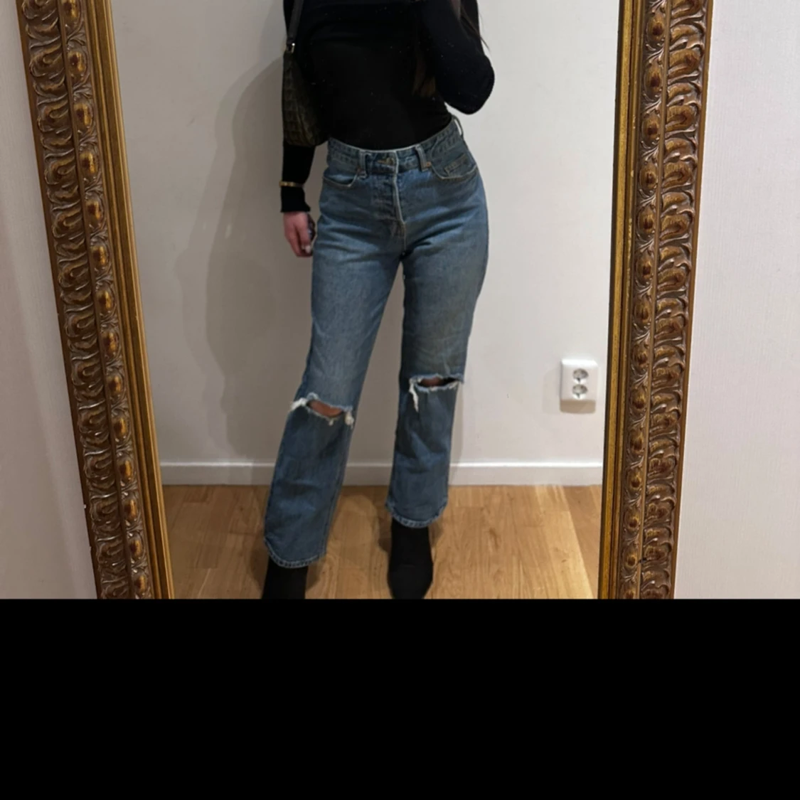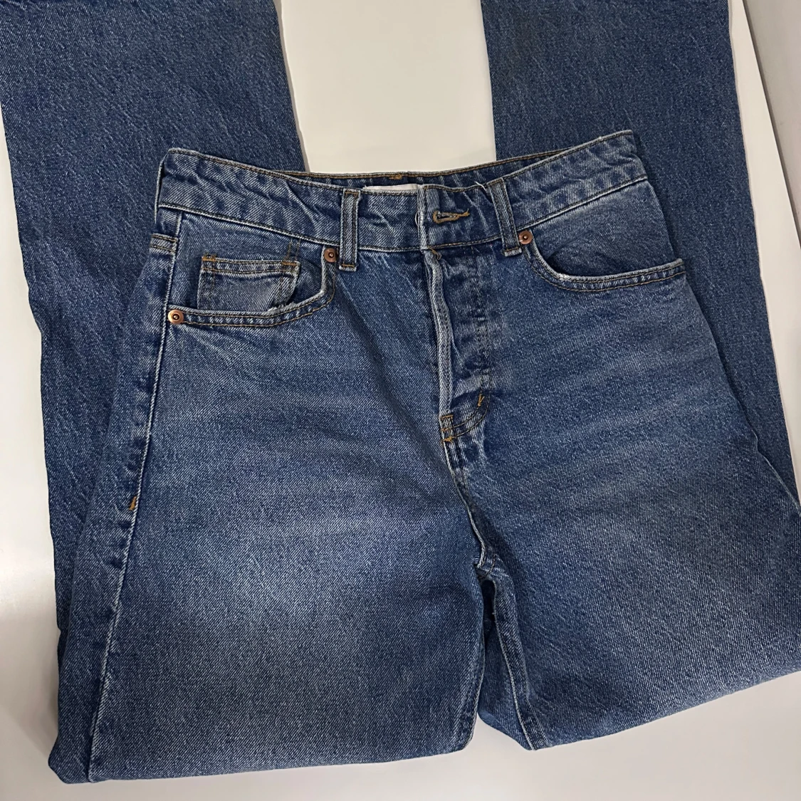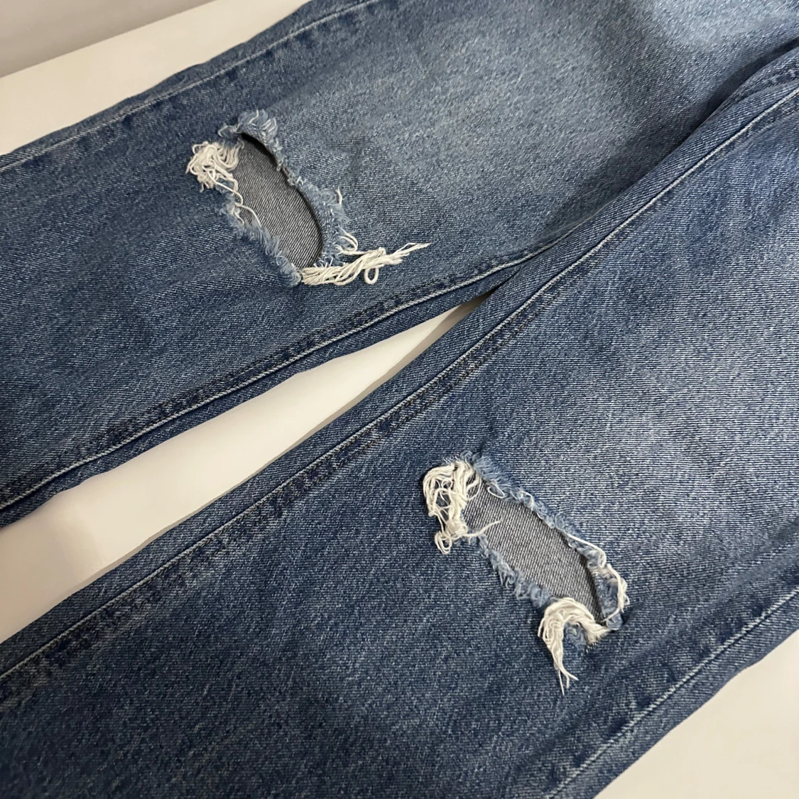 Mörkblå jeans med hög midja och raka ben från H&M. Jeansen har slitna hål på båda knäna.