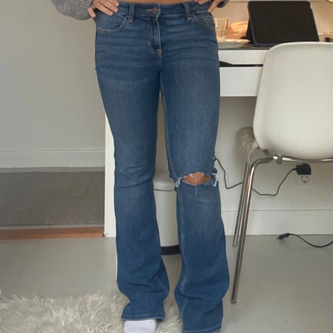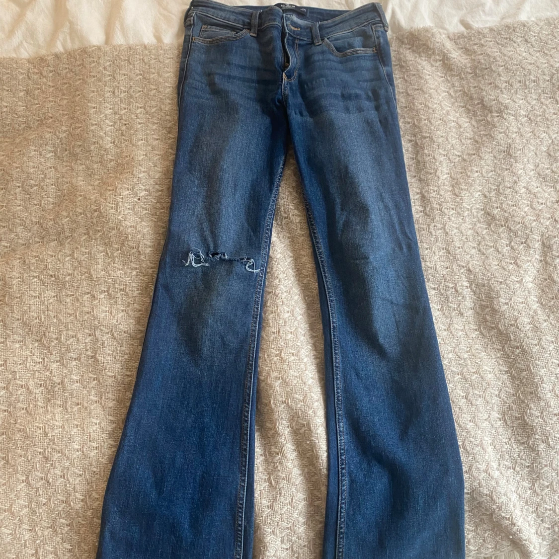 Säljer dessa skitsnygga bootcut lowrise jeansen från Hollister som är mörkblå med håll på knät. Jag är ca 168 cm lång och de passar perfekt på mig😊