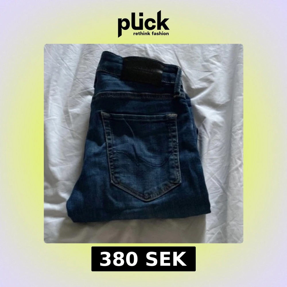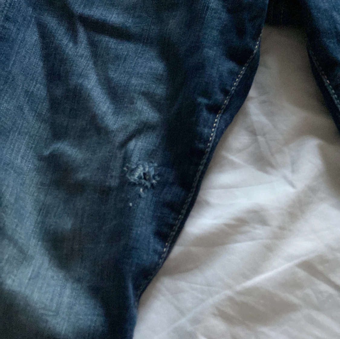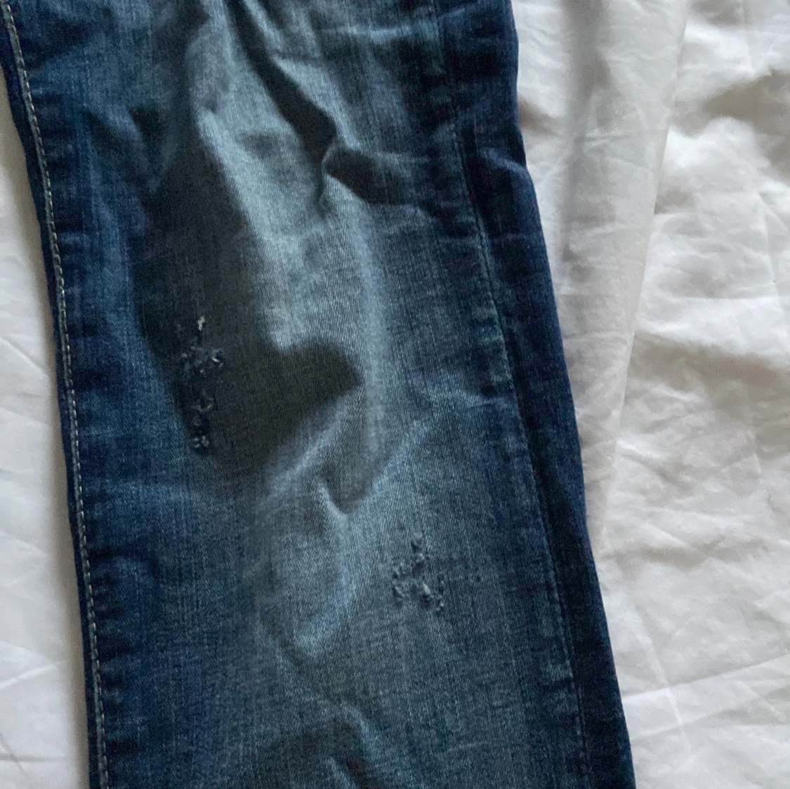 Säljer ett par mörkblå jeans med snygga slitningar och tvättade detaljer. Klassisk femficksmodell med kontrastsömmar och en bakficka med broderad detalj. Jeansen har en rak passform och är tillverkade i mjukt denimtyg.