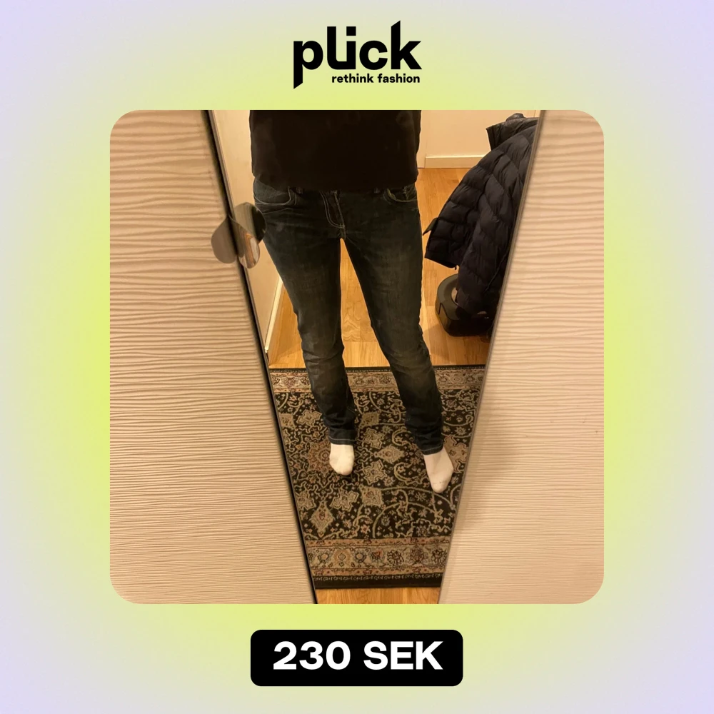 Säljer ett par mörkblå jeans i bra skick. De har en slim passform. Jag skulle säga att jeansen är raka men lite bootcut. Perfekta för höst och vår! Lågmidjade