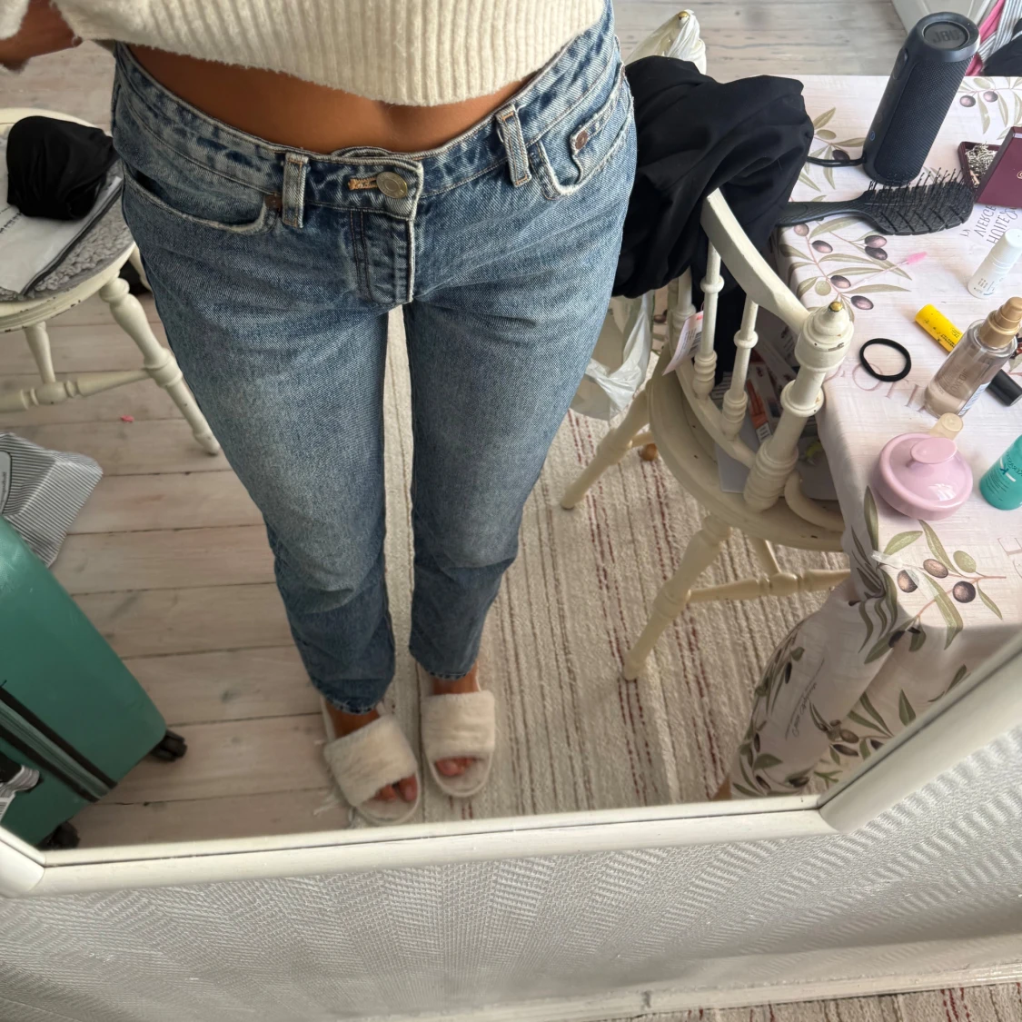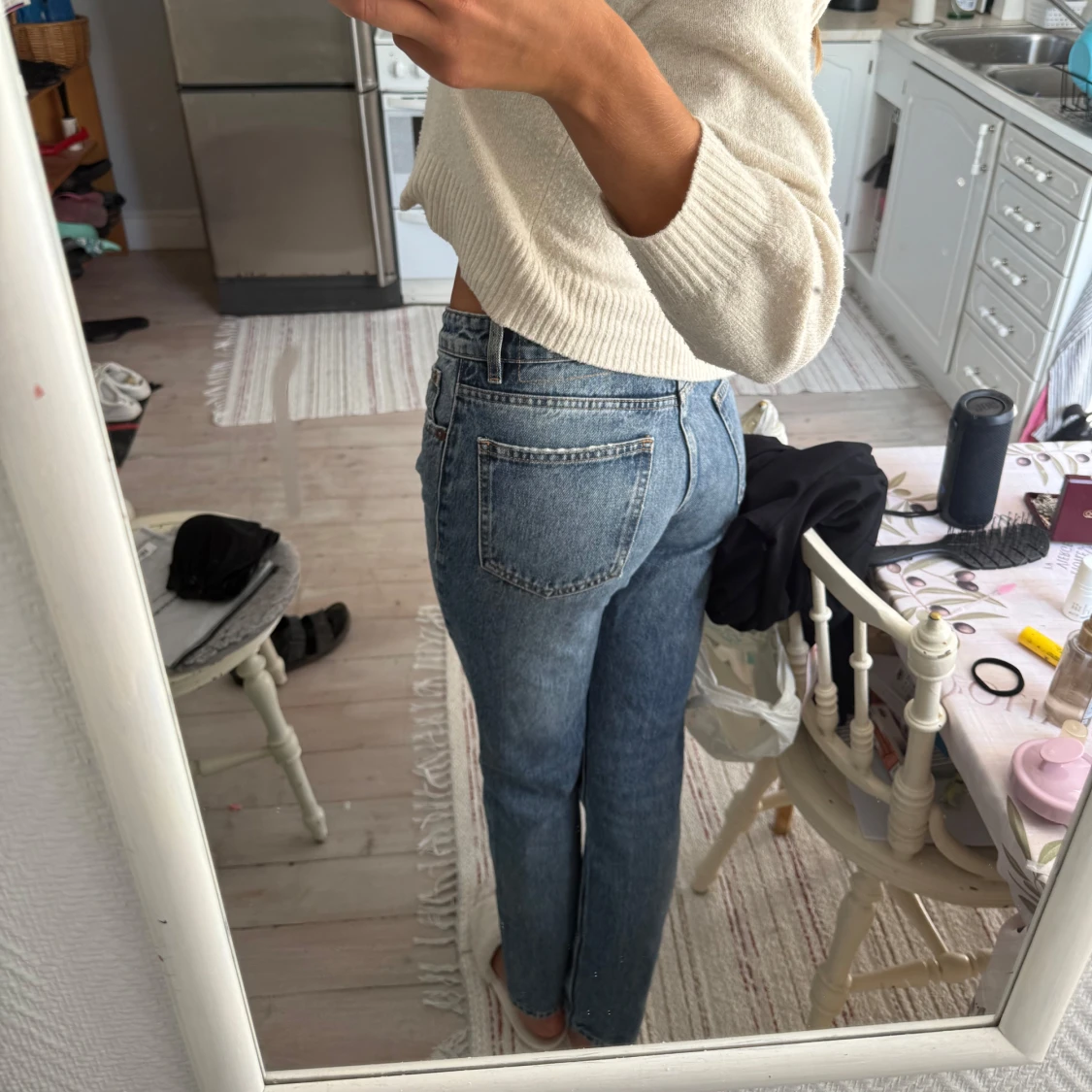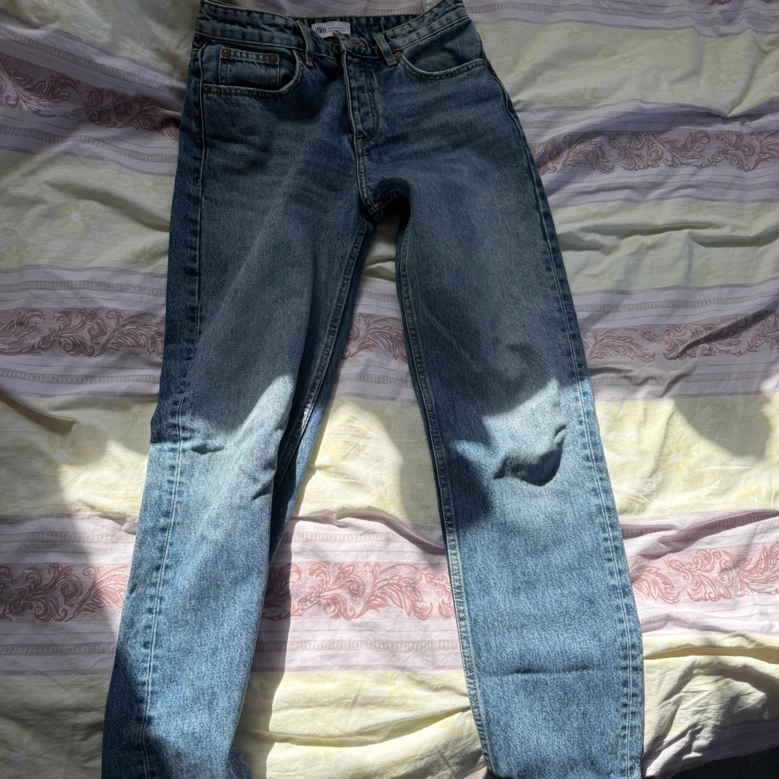 Snygga raka mörkblå jeans från Zara. Sitter snyggt på och är sköna. Hela och inte så mycket använda!
