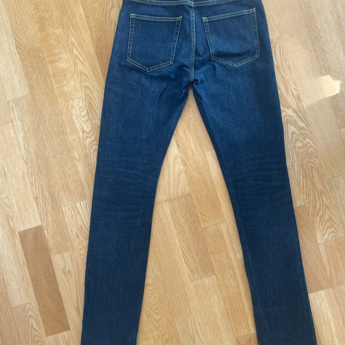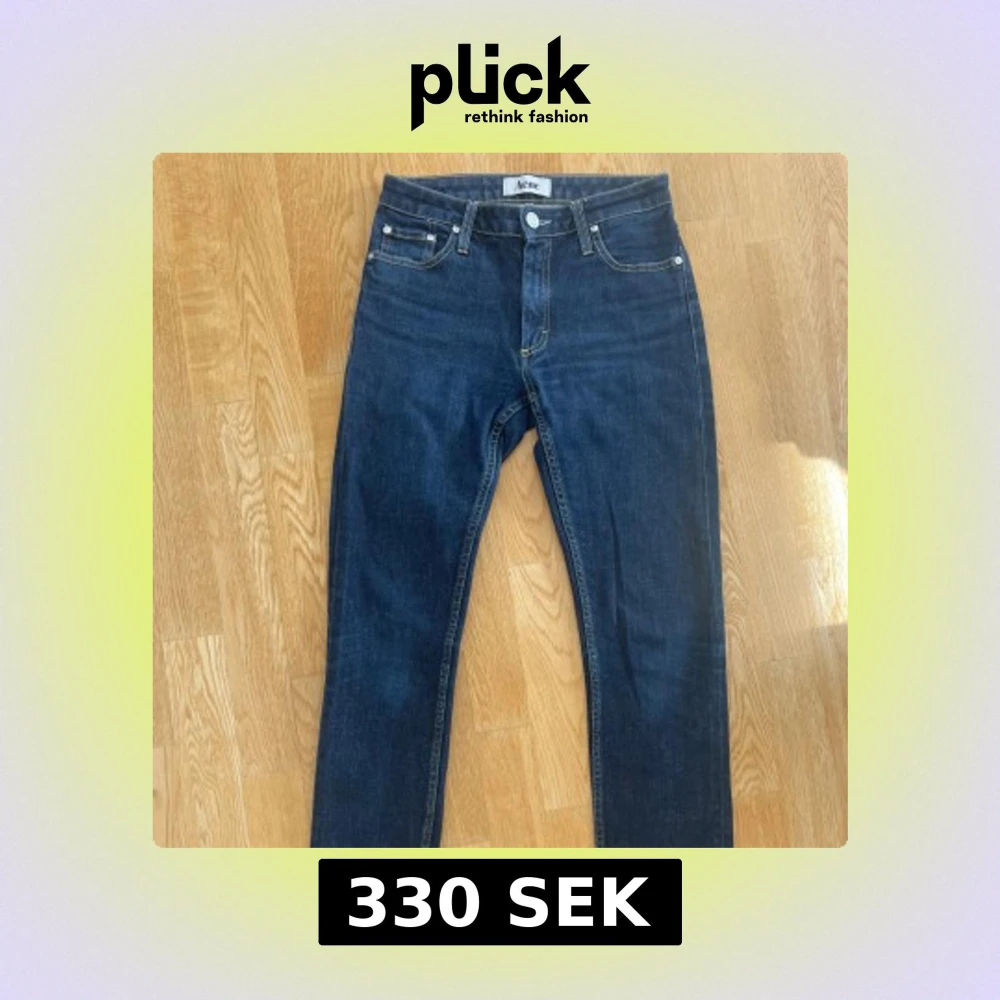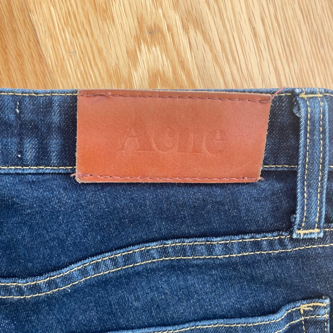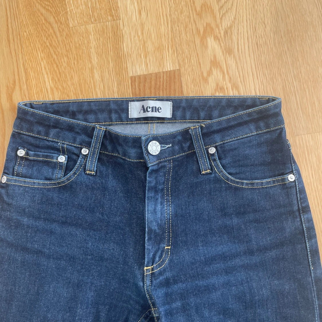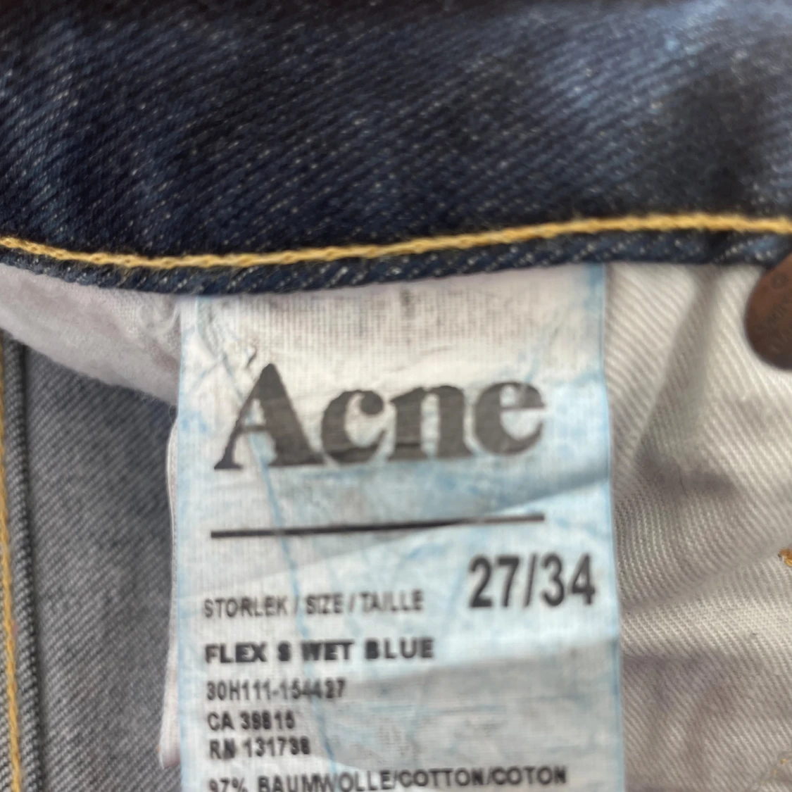 Mörkblå jeans från Acne med klassisk femficksdesign, smal passform och snygga kontrastsömmar. Byxorna har normal midja och raka bakfickor, smala ben, tillverkade i något stretchig bomullsdenim. Storlek 27/34. Perfekta för dig som gillar stilrena och tidlösa jeans.