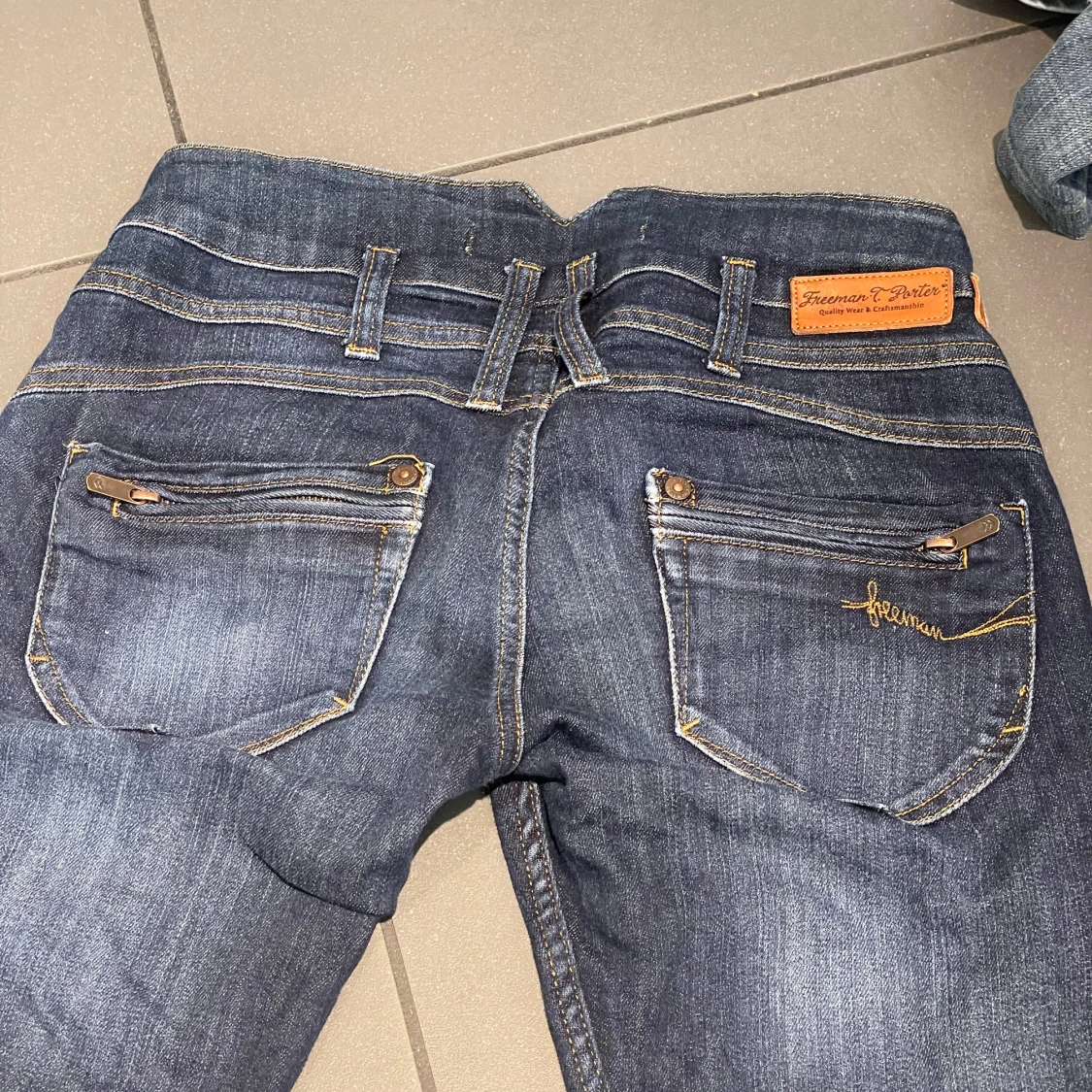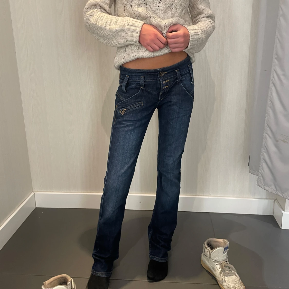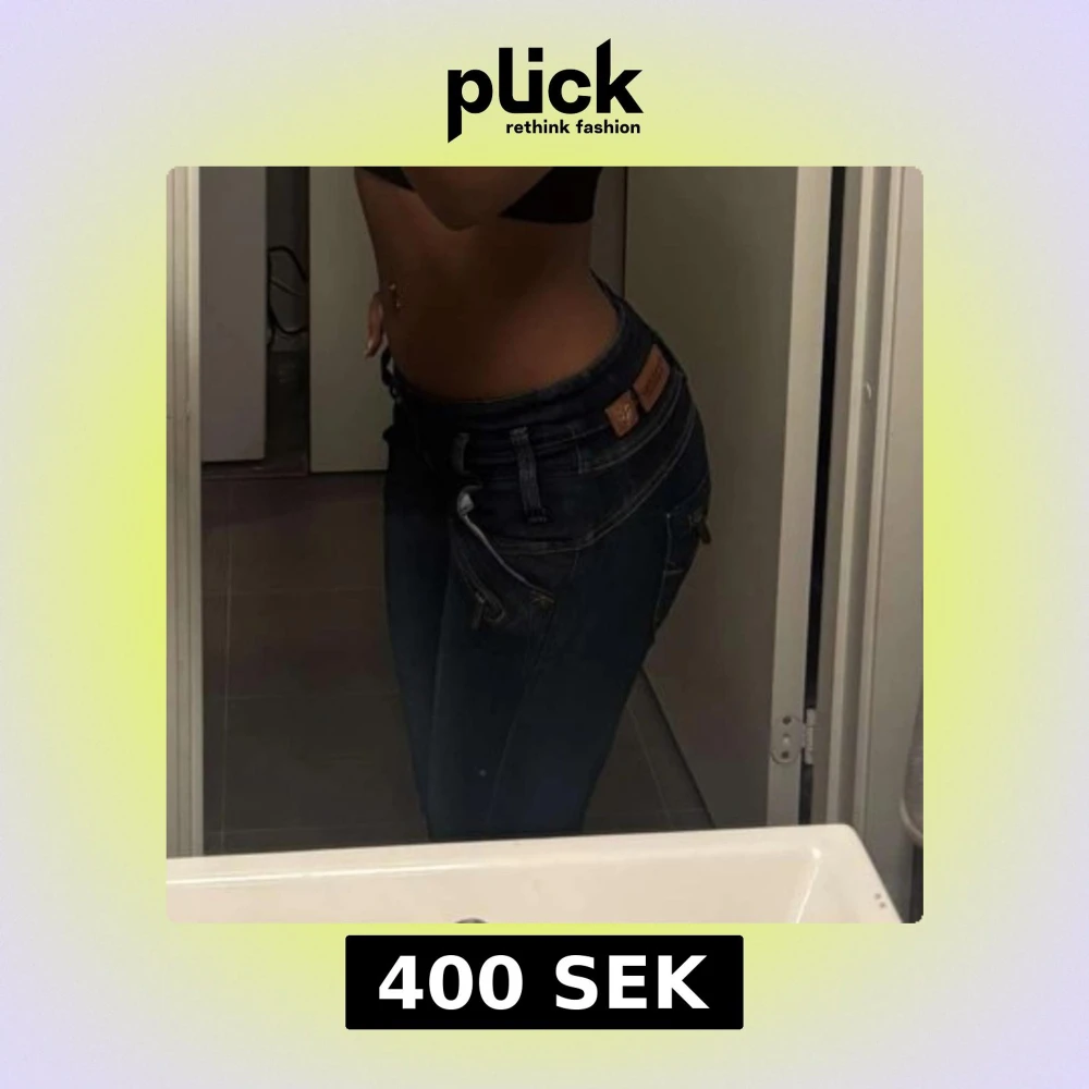 Snygga mörkblå jeans med låg midja och bootcut. Byxorna har flera detaljer som dragkedjor på fickorna och en broderad logga på bakfickan. 💓