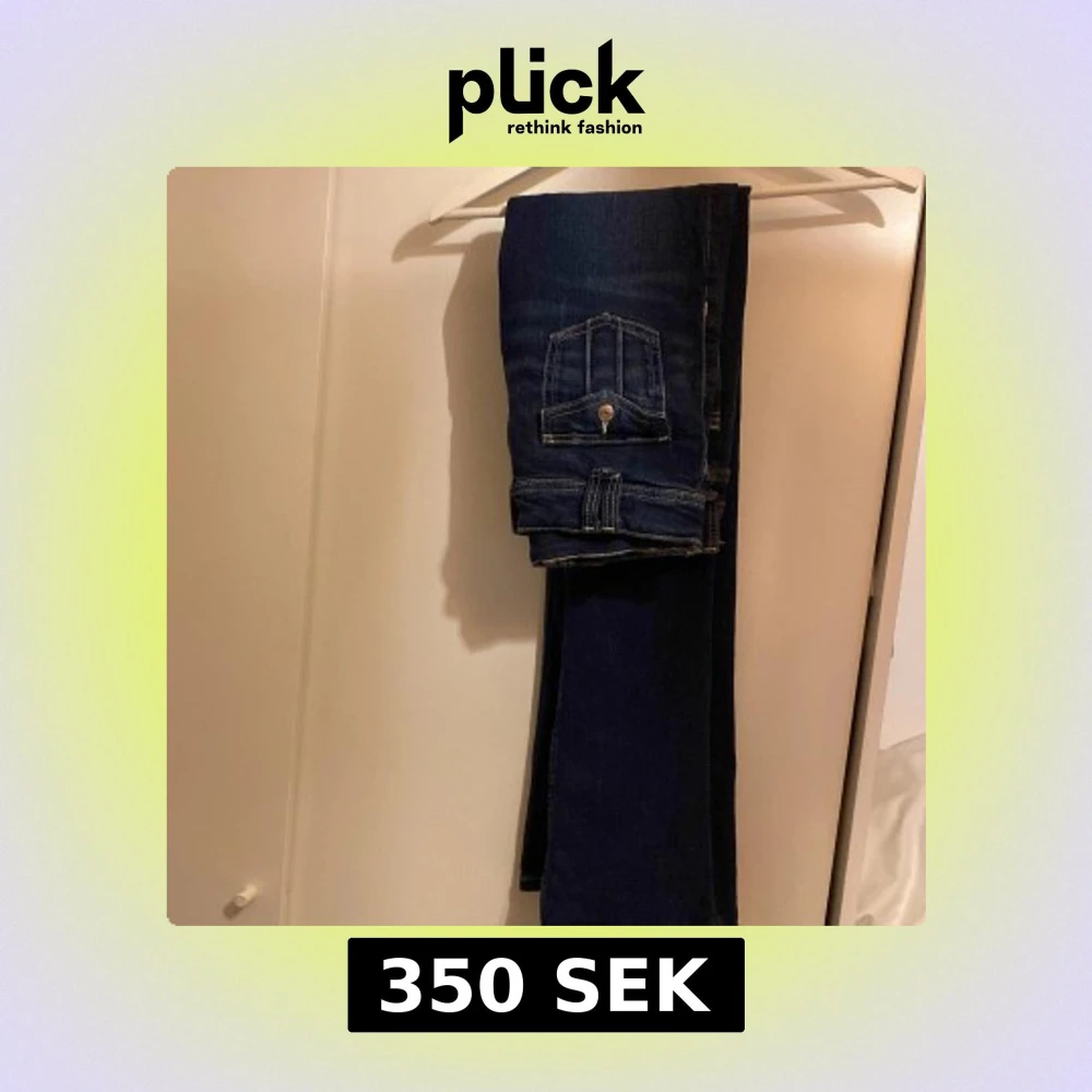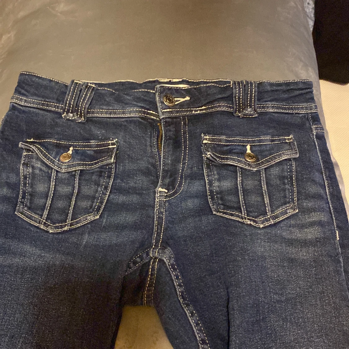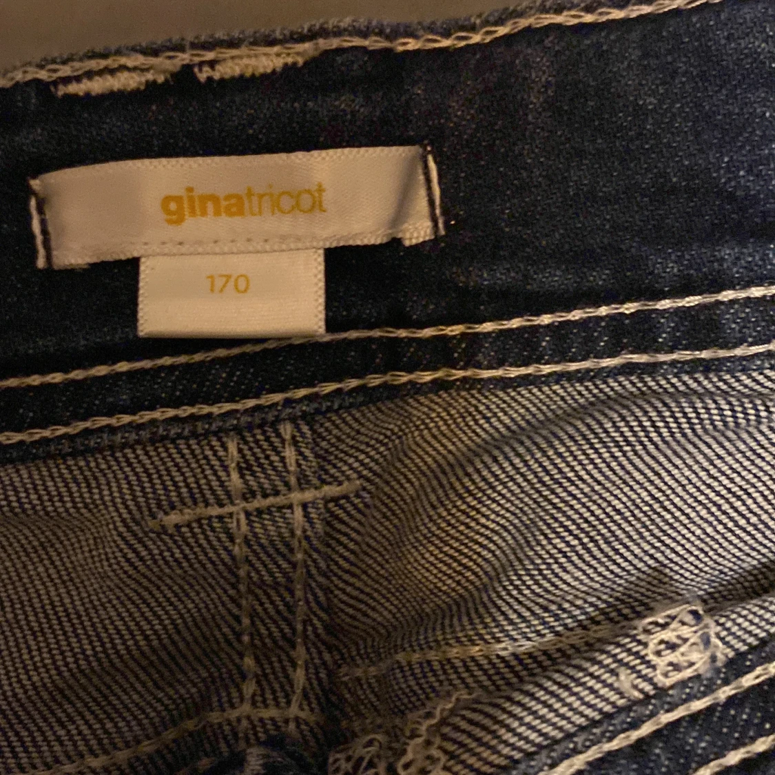 Mörkblå jeans från Gina Tricot med kontrasterande sömmar och fickor med knappdetaljer. Perfekta för en stilren look. De har en klassisk design med bälteshällor och knappgylf.