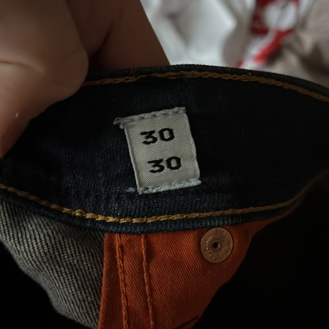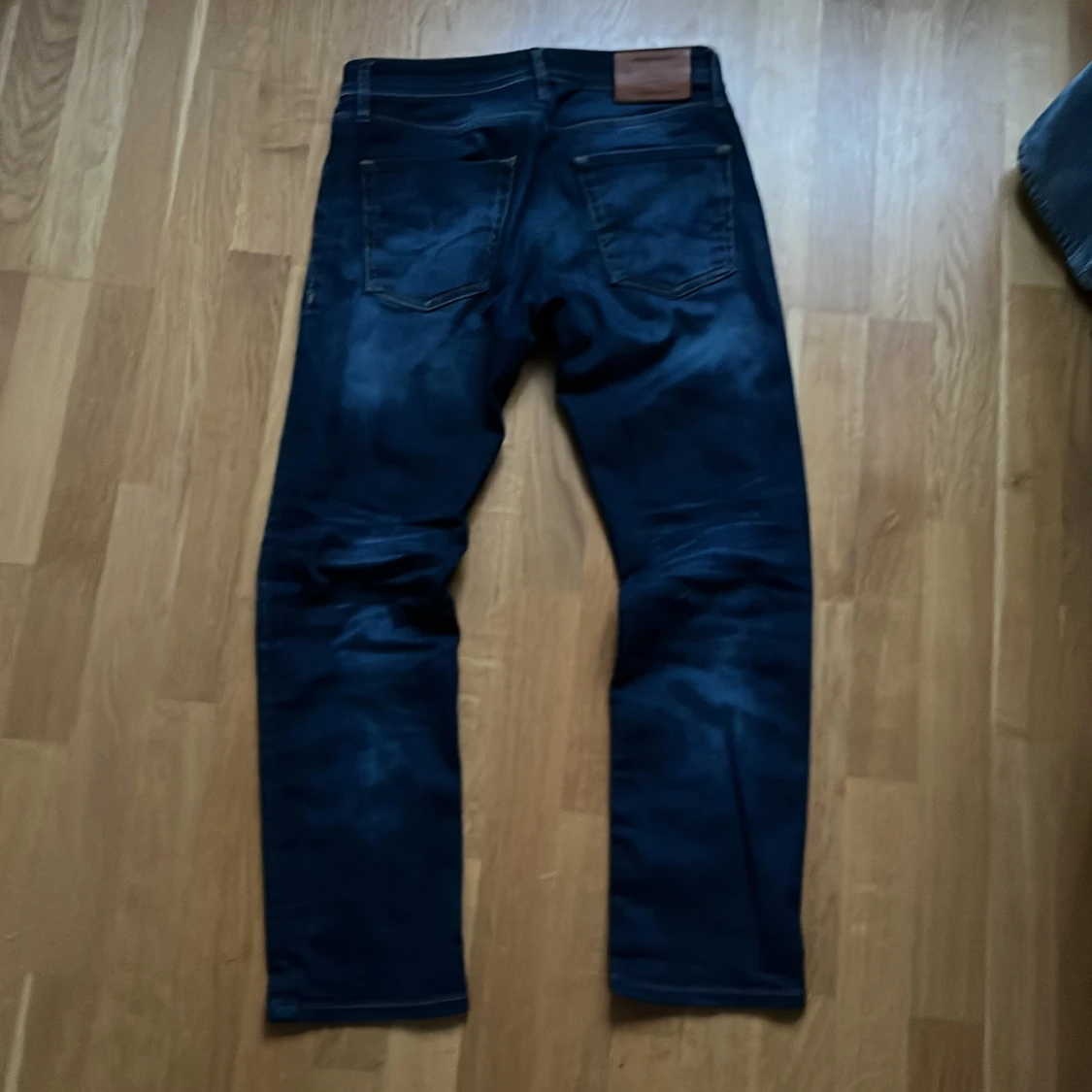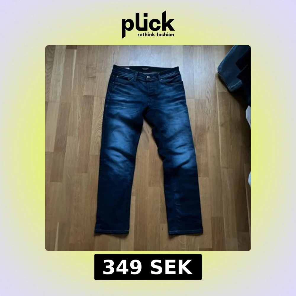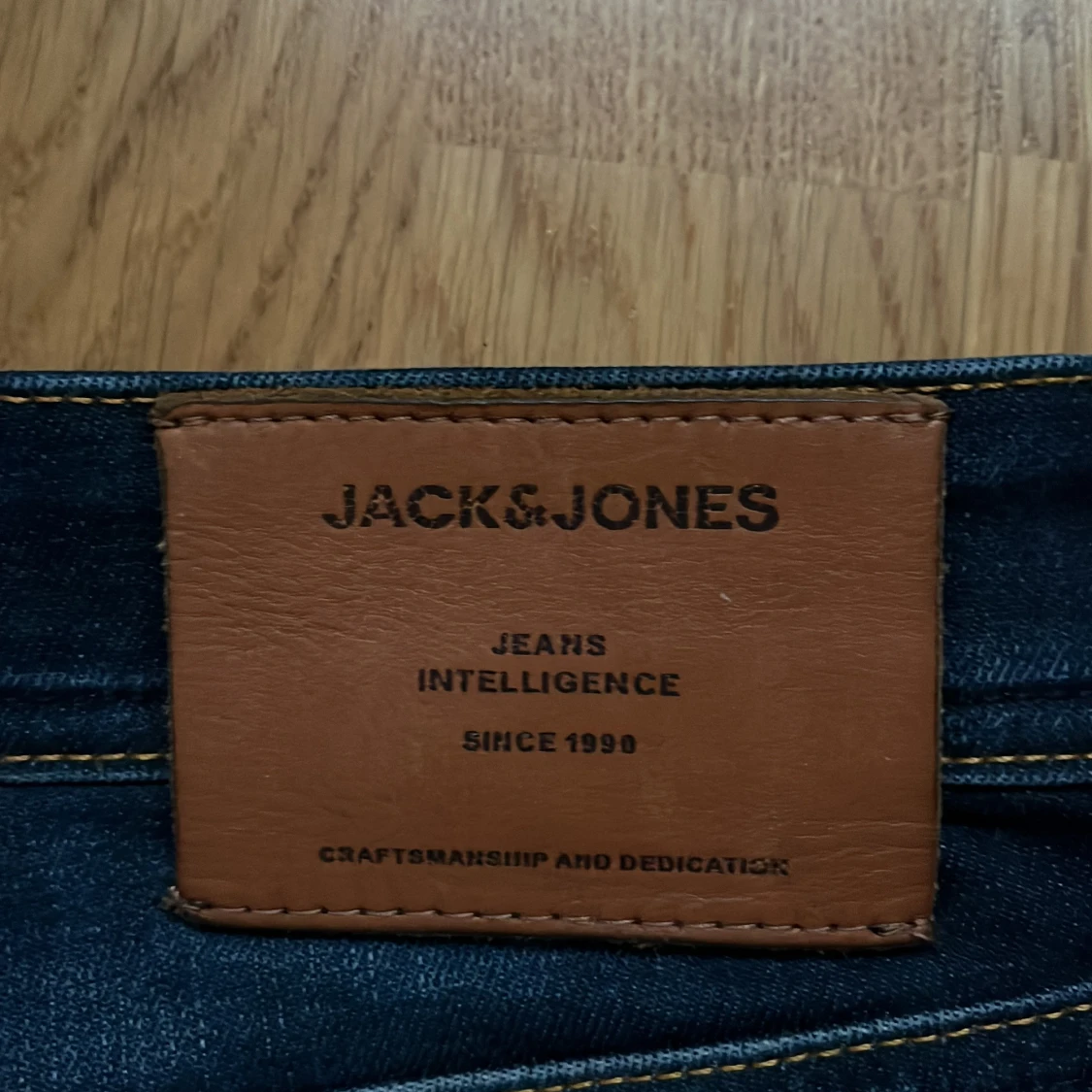 Säljer ett par snygga mörkblå jeans från Jack & Jones. De har en klassisk femficksdesign och en knappgylf. Perfekta för en stilren look. Pris kan sänkas vid snabbt köp